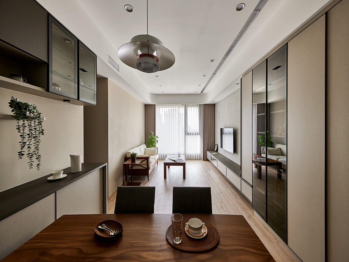 餐廳設計依舊延續室內的簡潔風格,由於餐桌一側靠著櫥櫃而立,櫥櫃採用滑櫃式拉門,方便取物或收納。櫥櫃檯面是鈦絲褐板材,櫃門則是黑五金手把框搭配亞麻灰門片。屋主對餐廳設計有其特別要求,餐廳是家的重心,家人回到家吃飯,都聚在餐桌,希望可以舒舒服服。「綠的傢俱」胡桃系列皮質餐椅,水曲柳實木的椅腳,餐椅高度也依屋主喜好與習慣做了適度調整,與原木餐桌互相搭檔,就是家人相聚最安心舒適的空間。