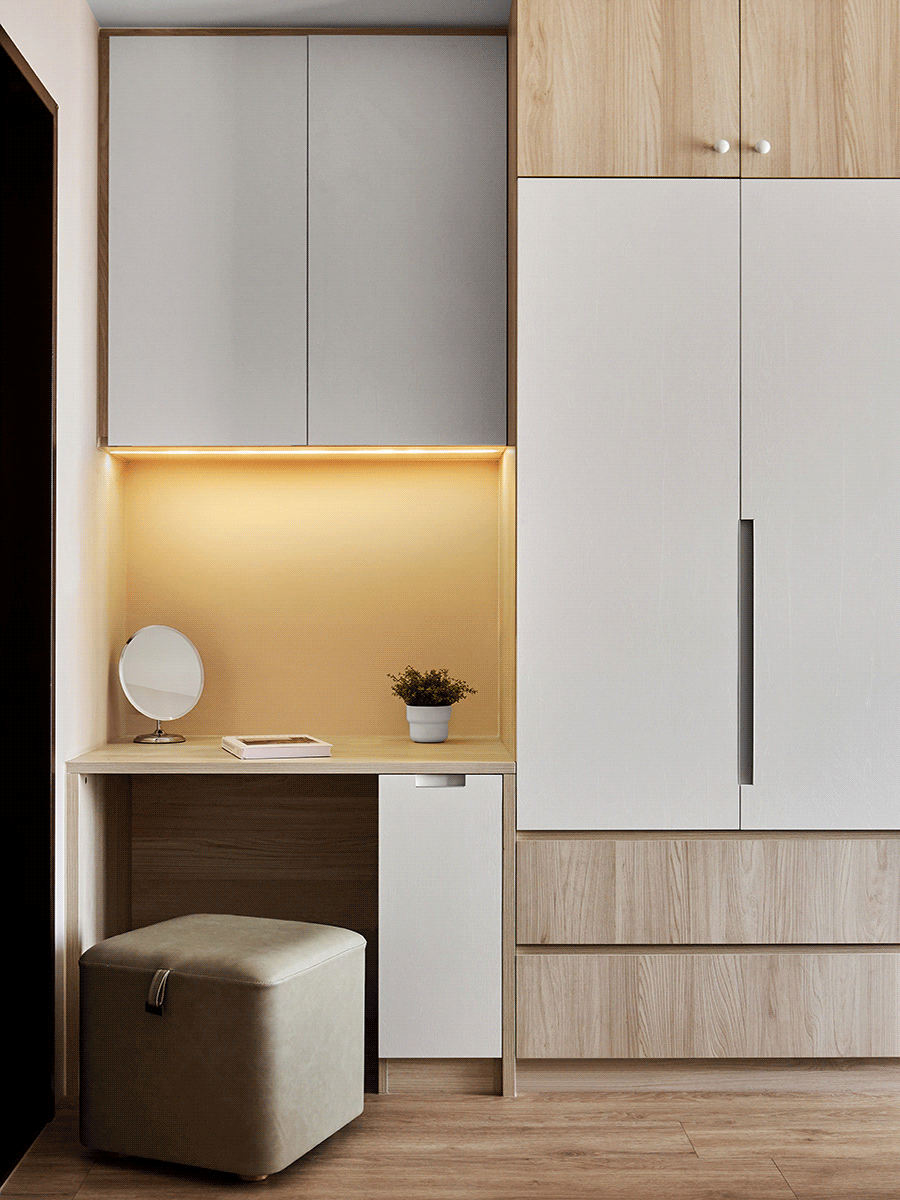 櫥櫃旁的全身穿衣鏡,以圓弧造型做了修飾,與天花板相呼應。天花板各角落以圓弧造型將樑柱的冰冷感隔絕,各空間的線條也以親和的圓弧造型緩和視覺。