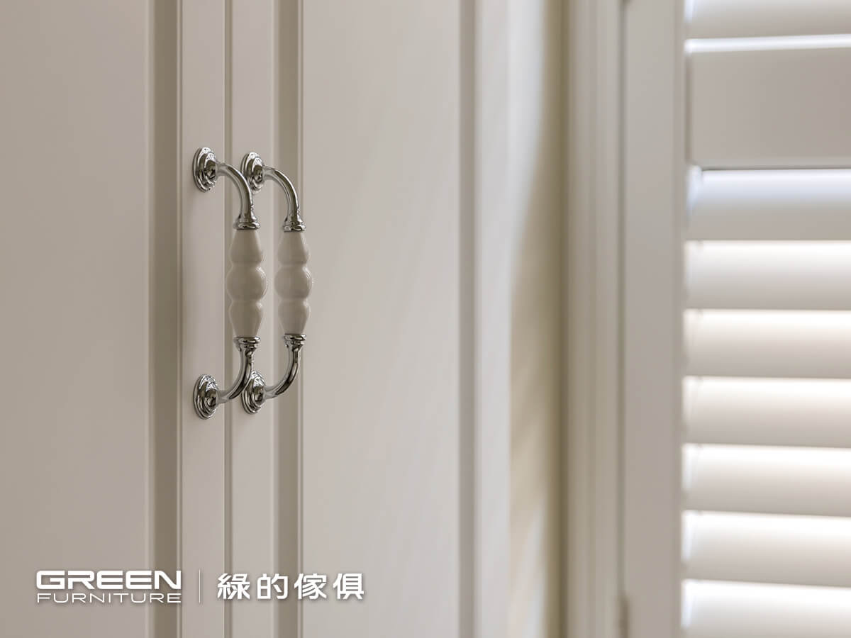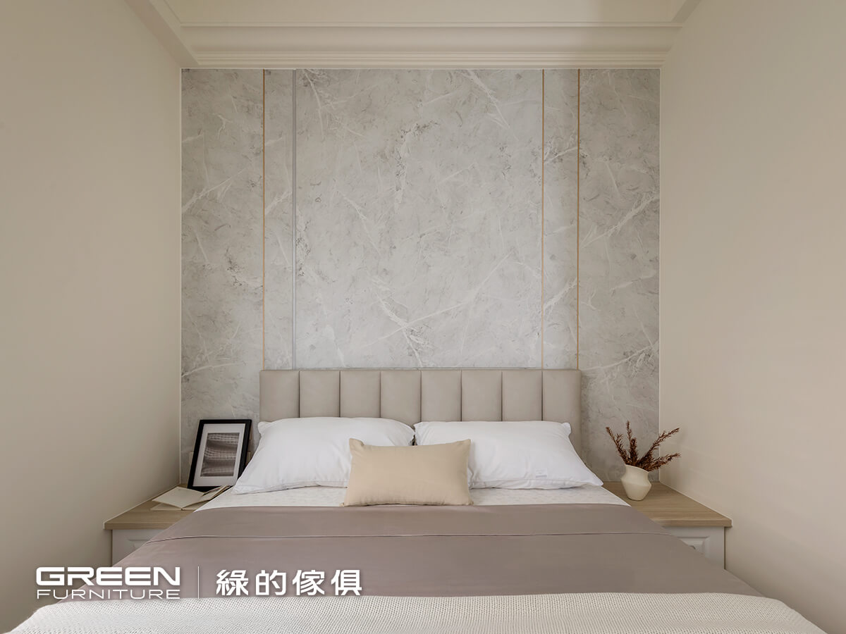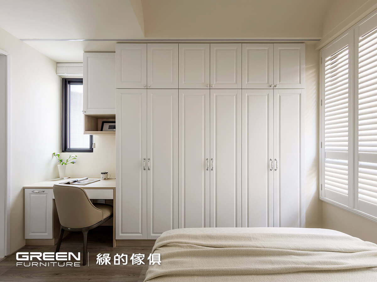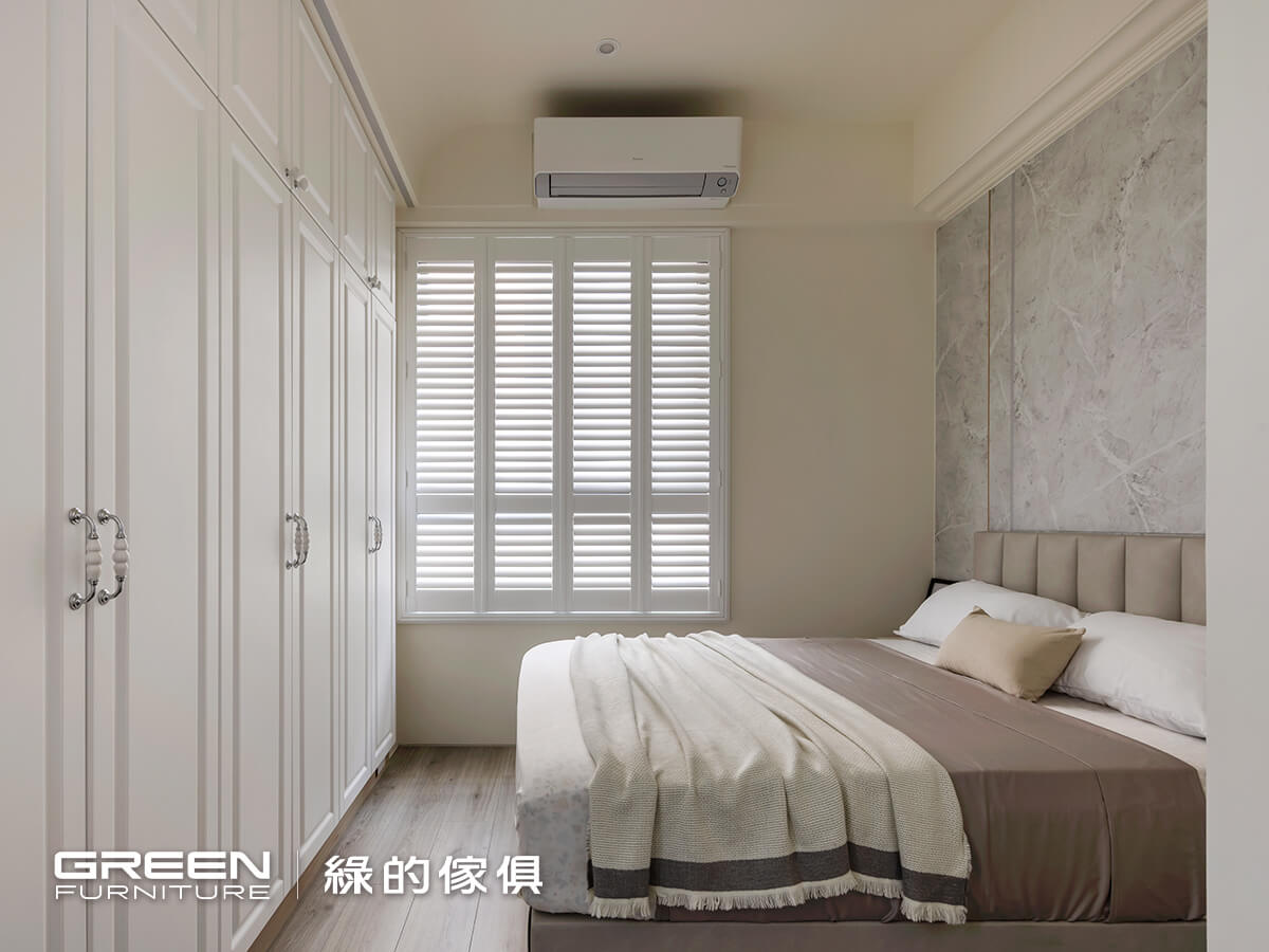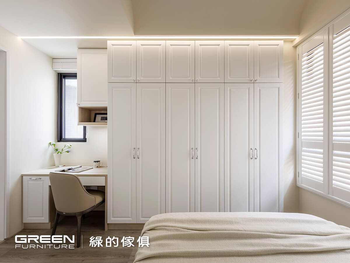 為了讓視覺感變大採用清新「白雲岩」系統板材作為床頭牆,柔化樑下視覺壓迫感,並增添天然礦石般的紋理細節。衣櫃則搭配「歐式鄉村陶烤白色」門片與香檳金把手,融合百葉窗設計,細節中展現純粹而細膩氛圍。燈光設計延續柔和主軸,以層板燈與 LED 線燈交錯配置,自床頭一路延伸至展示櫃,營造如晨光輕拂般的柔光氛圍,包裹整個房間,讓每一次歸寧皆是溫柔的擁抱。