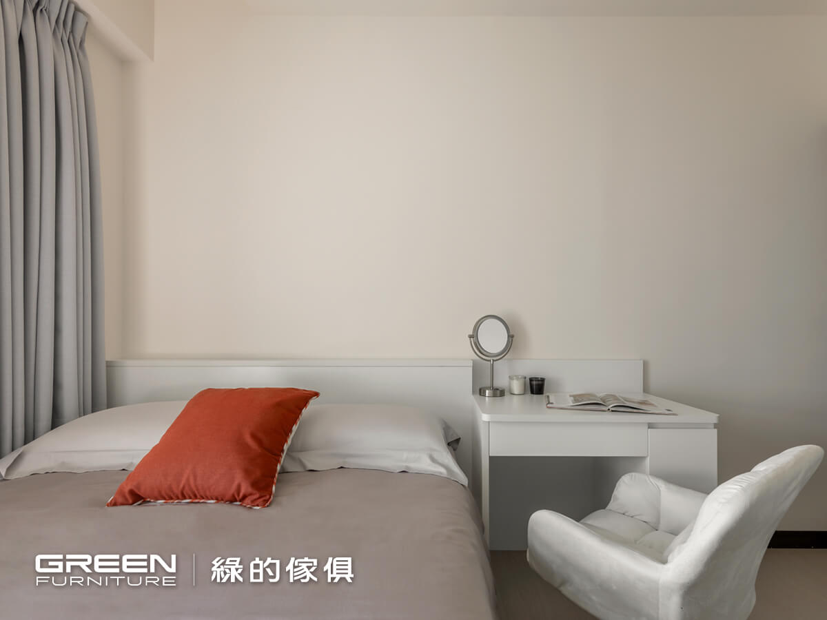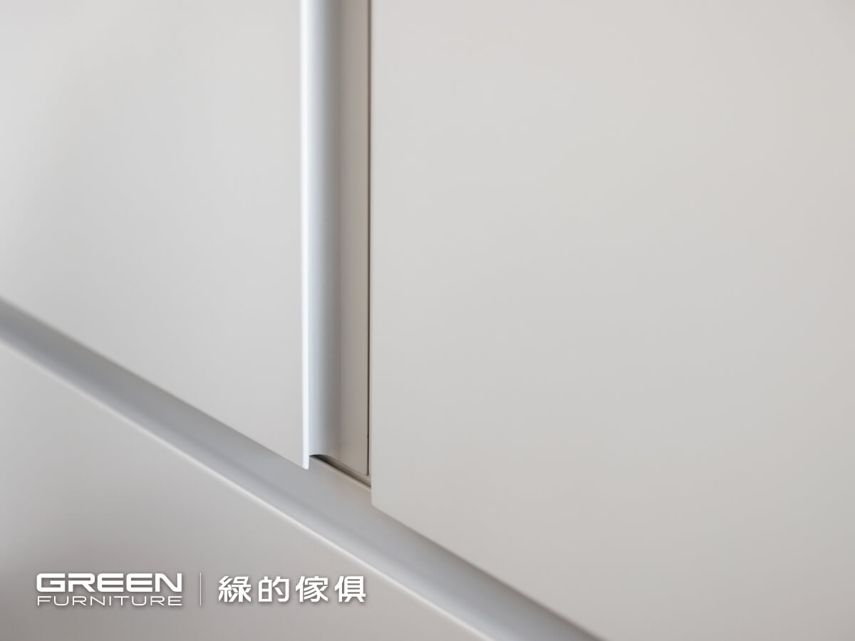 以黑、灰、白配色為主軸,白色陶烤與灰色霧面陶瓷烤漆的門片搭配,更能凸顯純粹舒適的氛圍;藉由系統板材量身規劃特性,讓訂製的系統傢俱,如:床頭櫃、抽屜床、衣櫃等都能呈現一體成型的美感,不論是收納或展示,所有空間都能被完整運用。
