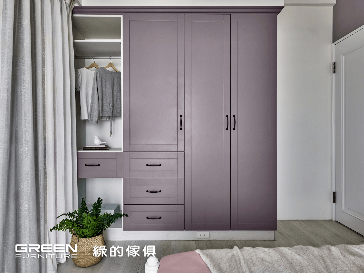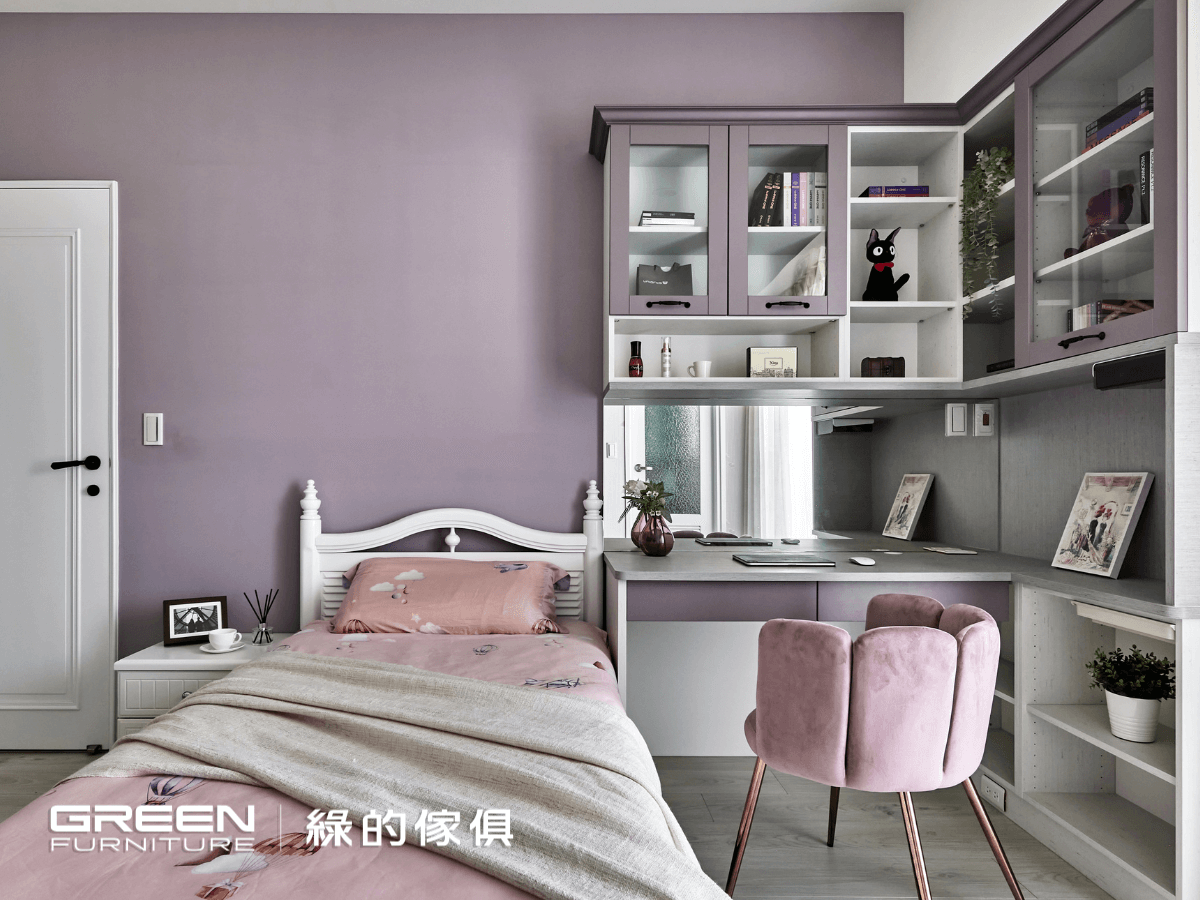 空間風格延續全室柔雅路線,細節上則融入更多女孩喜愛的元素,像是輕柔窗紗、曲線造型吊燈、暖色系木地板等,讓房間多了份浪漫而沉靜的氛圍。綠的傢俱特別善於從屋主家庭的實際需求出發,這間房即採用系統櫃兒童房配置,將衣櫃、展示櫃、開放書架與穿透式窗邊櫃結合,不僅提升收納機能,更讓空間感通透無壓。
