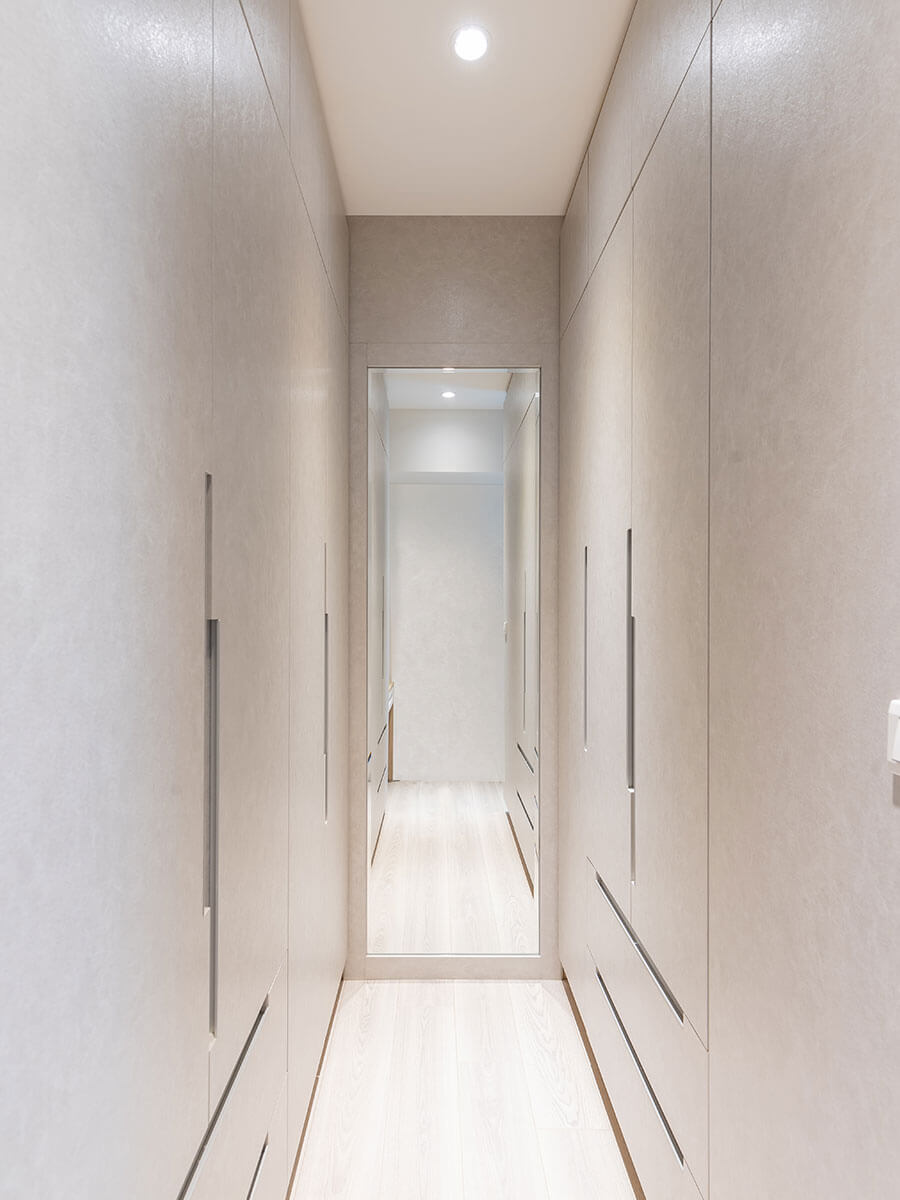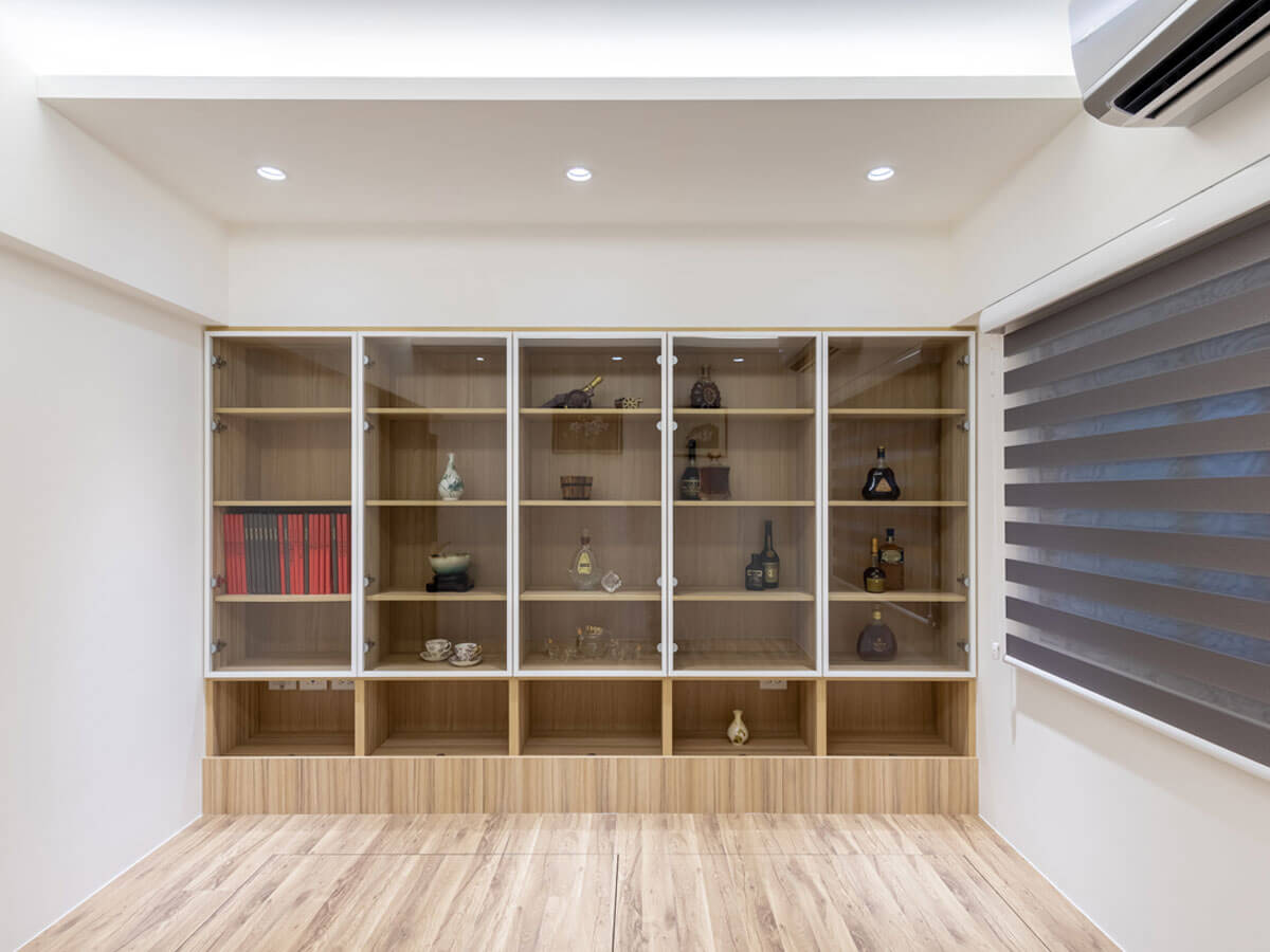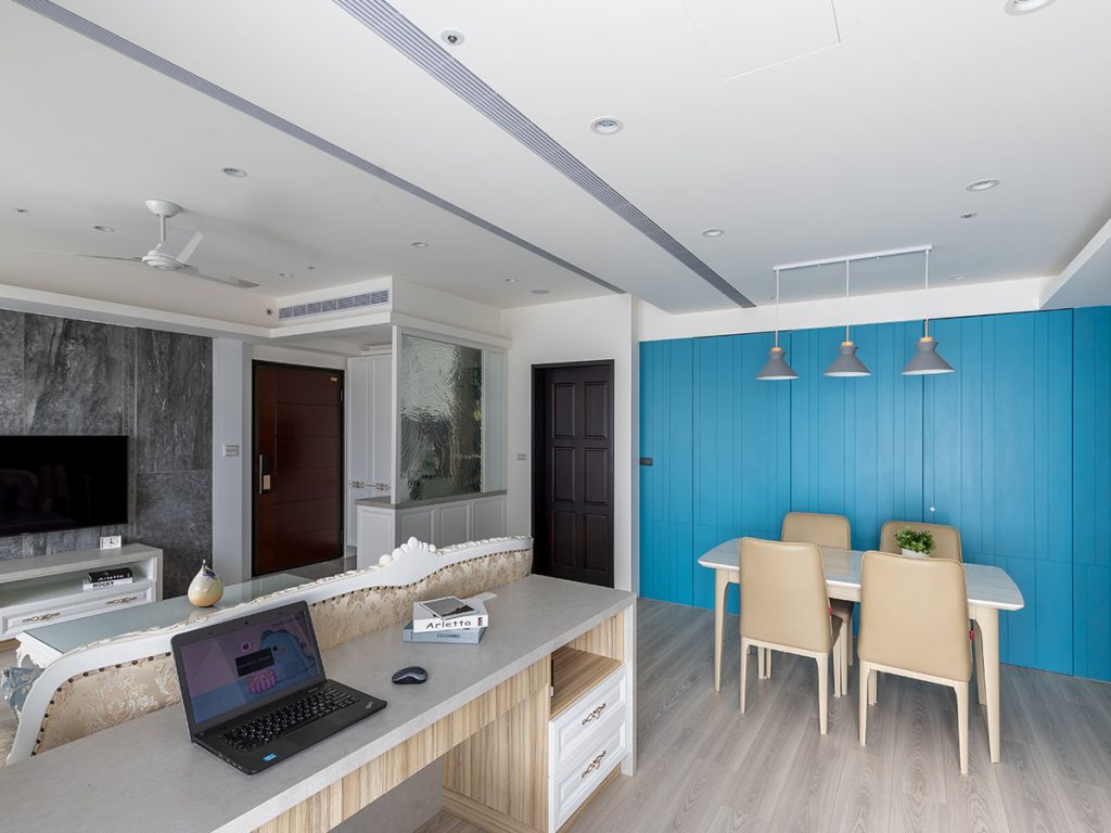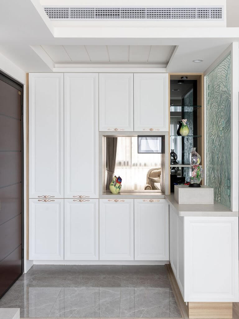 「綠的傢俱」秉持務實、專業、熱忱信念為顧客服務,方先生、方太太在第一棟房屋尋找室內設計時,就已肯定,「老品牌永續經營最好,我們買下新屋還能再找它。」老品牌、大品牌卻願意傾聽溝通,售後保固隨叫隨到,安心保證宅到家。走進「綠的傢俱」復興店系統規劃設計師李玫樺、「理想家」翁翊濰通力合作、落實呈現的作品裡,首先感受到原木為底色、白色系為主調的新古典風格,客廳、餐廳、男主人電腦工作檯都在開放式的大空間裡,為讓訪客入門後有內外之別,迎賓玄關應運而生,沿著L形屋角樹立的白色系統櫃,下櫃放鞋,上櫃收納,淡金色平台與框格用來展示招財藝術品,流水紋玻璃背板有助提升屋內明亮度,寓意財源滾滾。