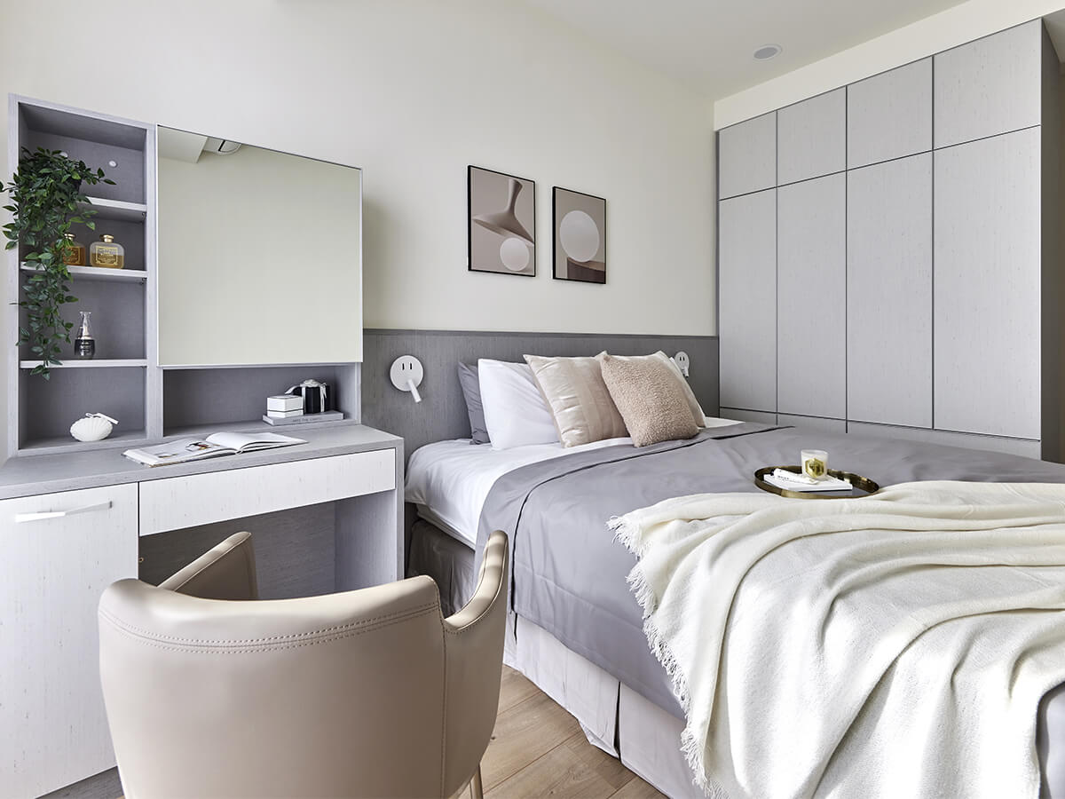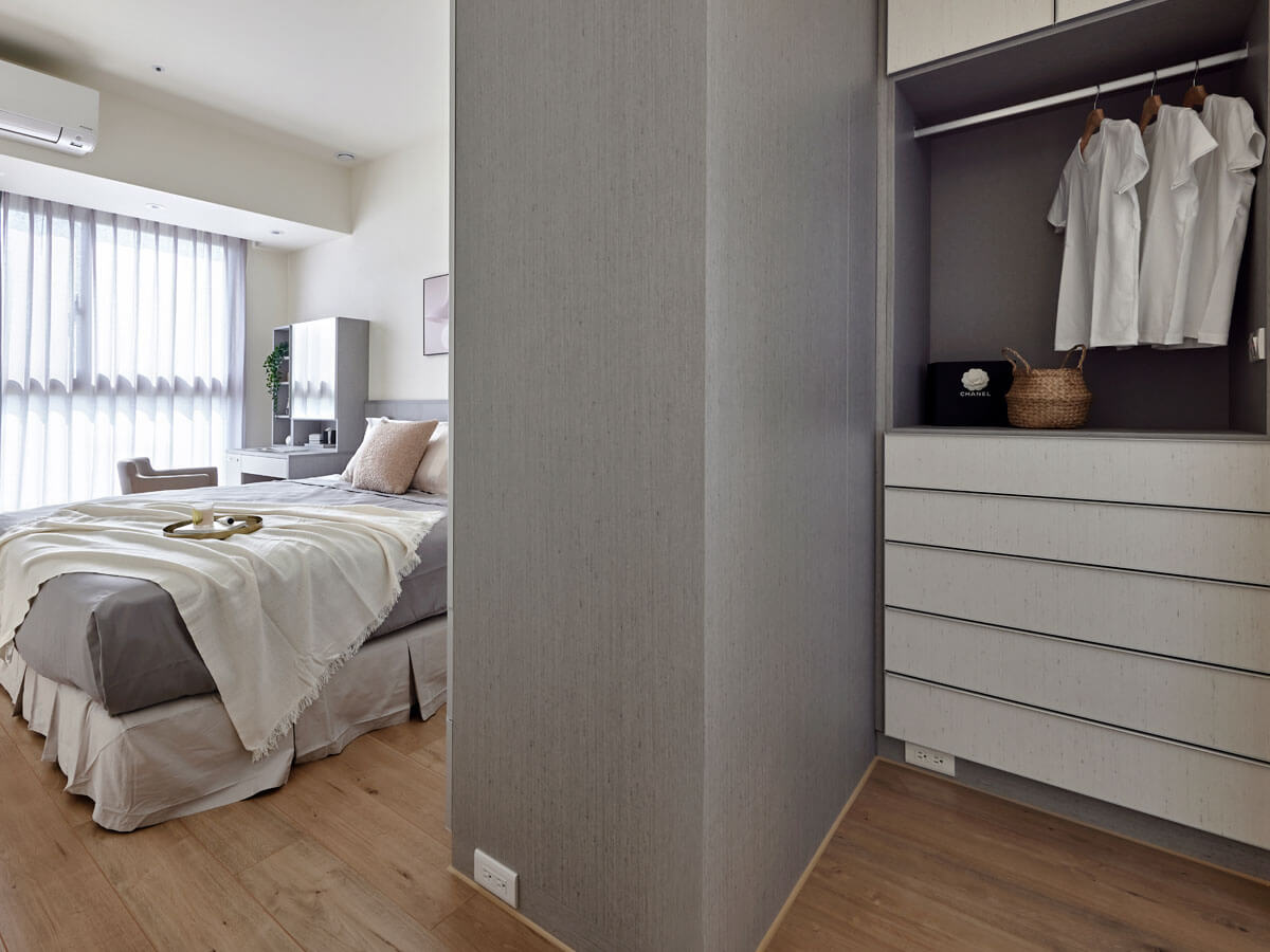 主臥室充分發揮現代北歐風的素樸、留白、療癒精神,麻紗灰色澤的床背板就如同沙灘的細沙那麼返璞歸真,配合屋主要求,資深的系統櫃師傅特別製作厚度3.6公分的床背板。系統衣櫃的側面也是麻紗米,然而門面為麻紗灰,一櫃當關,作為進門的玄關,面對雙人床的正面則選用麻紗米門片,有拉大空間感的作用,另在門後也有一組較窄的衣物櫃,填充小空間,善盡收納大用途。