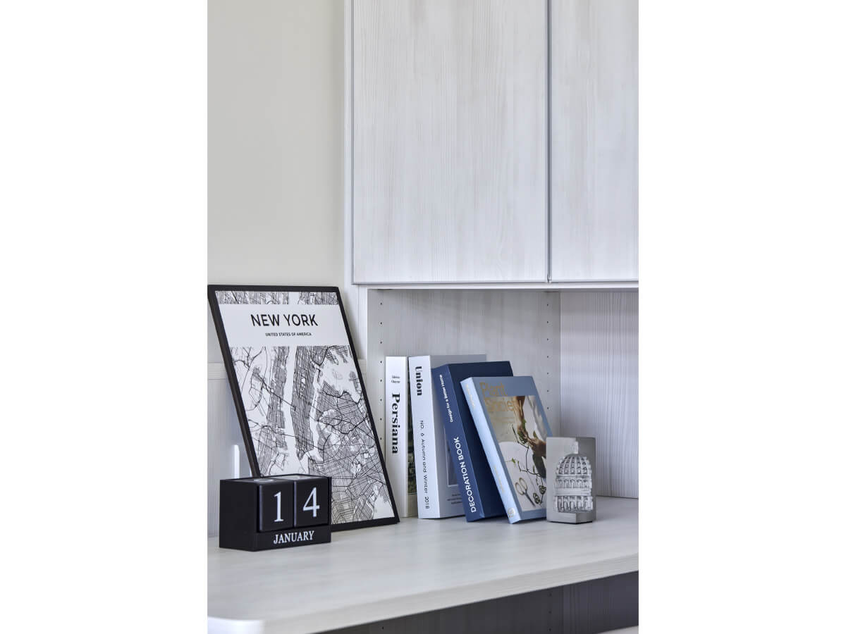 看向右邊,中島吧檯餐桌量身定做,透著灰紋的賽麗石桌面柔和、易清潔,外側配置有細格櫃以便用餐置物,面向廚房的內側桌有尺寸正好的置物櫃,恰可推進電鍋、微波爐等電器,而朝向走道的桌上直立面竟然還規劃出擺放小盆栽與馬克杯的玻璃層板櫃子,泛起驚喜漣漪,空間利用果真最大化。