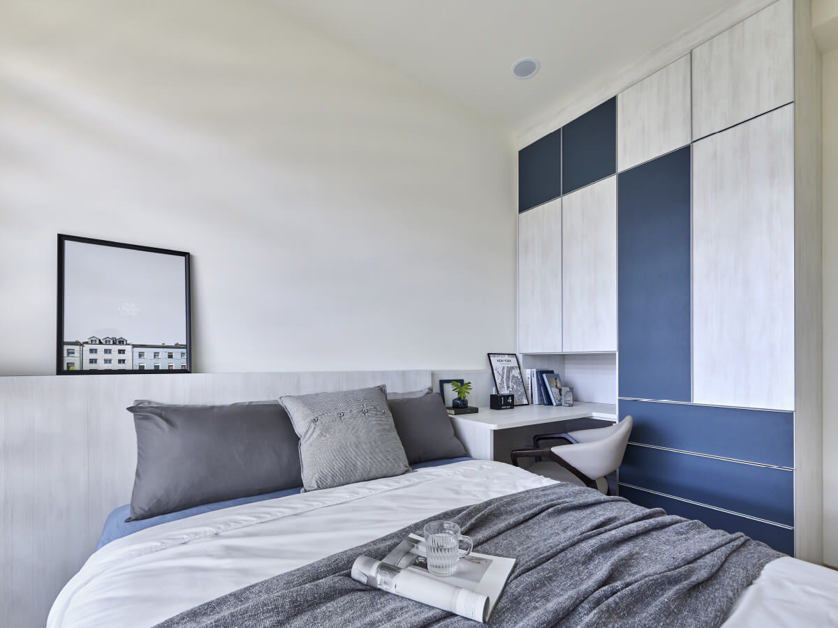 大兒子房間的設計,迎合他所喜愛的現代感,發揚淺色系主調的質感,空間顯得更加大,波布藍、沁白雙色構成的美學衣櫃,如同純淨海水拍擊著的海岸線,床側書桌極簡卻巧妙地穿入衣櫃,床頭背板上方由木工師傅埋入橫條的長燈與蓋板,很「厚工」,提供了柔和空間的間接光源,符合屋主理念,大兒子很讚許。