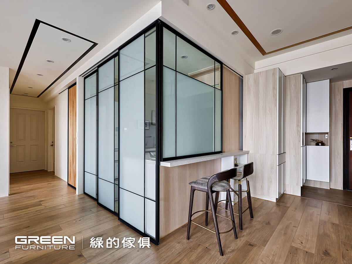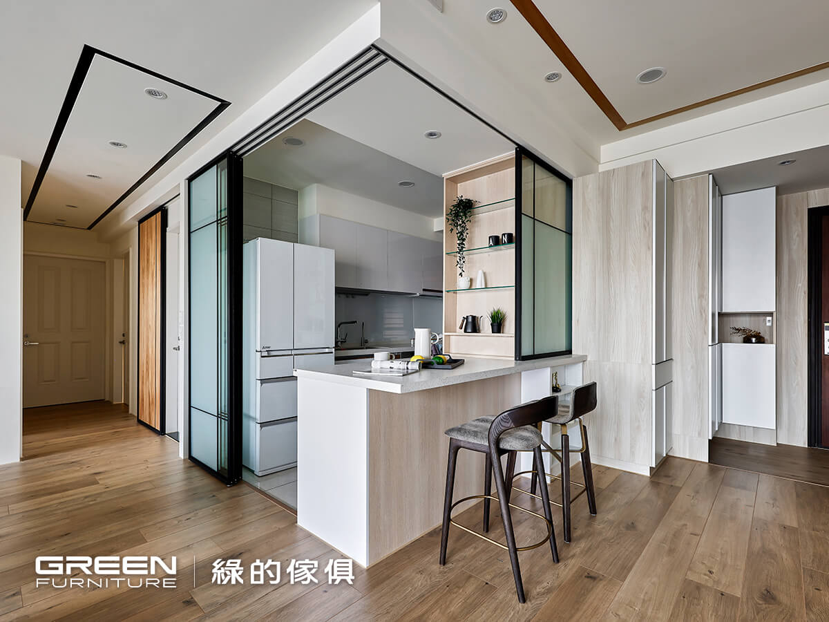 系統櫃設計師王詣筑說,屋主貨比三家,繞了一圈後,相信「綠的傢俱」系統櫃以及整體規劃設計的品質,尤其「綠的傢俱」採用F1級歐洲進口櫃體系統板材,達到環保、健康、舒適室內空間品質的最高等級,售後服務也讓人信賴,而自己與崔麗麗攜手組成的系統櫃設計、空間裝潢任務小組默契感十足,屋主能夠放心,終於正式簽約委託。