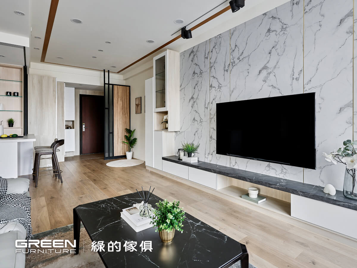 從入門屏風後方往裡頭走,兩座白色系的系統櫃緊靠著站立,充滿和諧中的活潑舞動線條美,挖空開放與關門展示的櫃門、木質與玻璃材質的交映,引導走向近窗的大器沙發區,仿石紋的客廳電視牆起用金飾條串接板材最緊密,有如自然風景屏面,配置簡單俐落的電視下方一字型收納櫃,風華更突出。