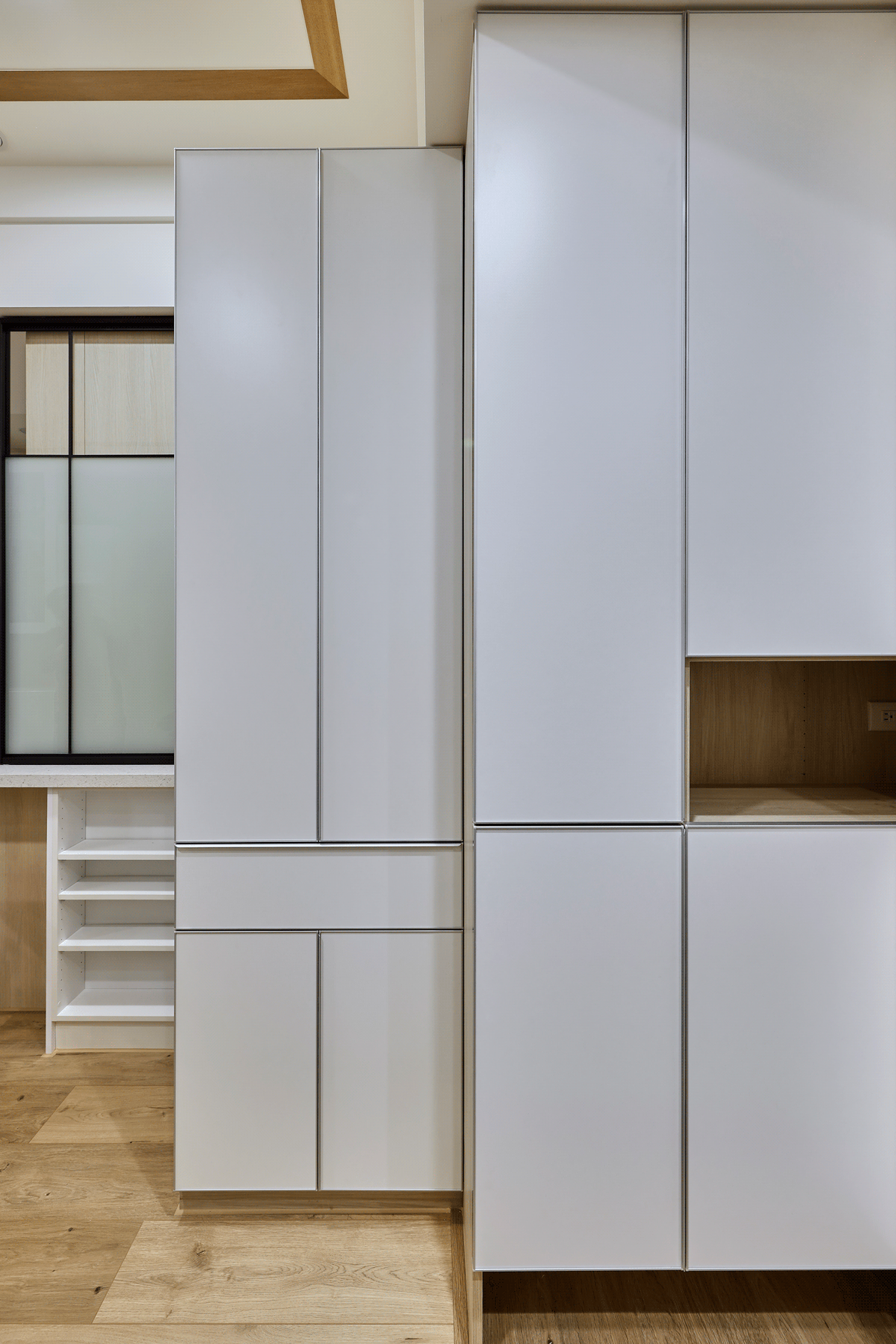 進門後,順著木紋壁面延伸,右側安放一組白銓色板材、銀色鋁框拉門的衣帽鞋櫃,雅潔感迎面而來,櫃體不僅提供多功能收納空間,中間還可陳放飾品,打燈以後,變成引人觀賞的亮點。