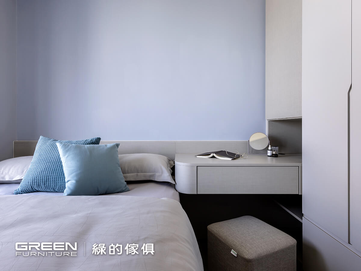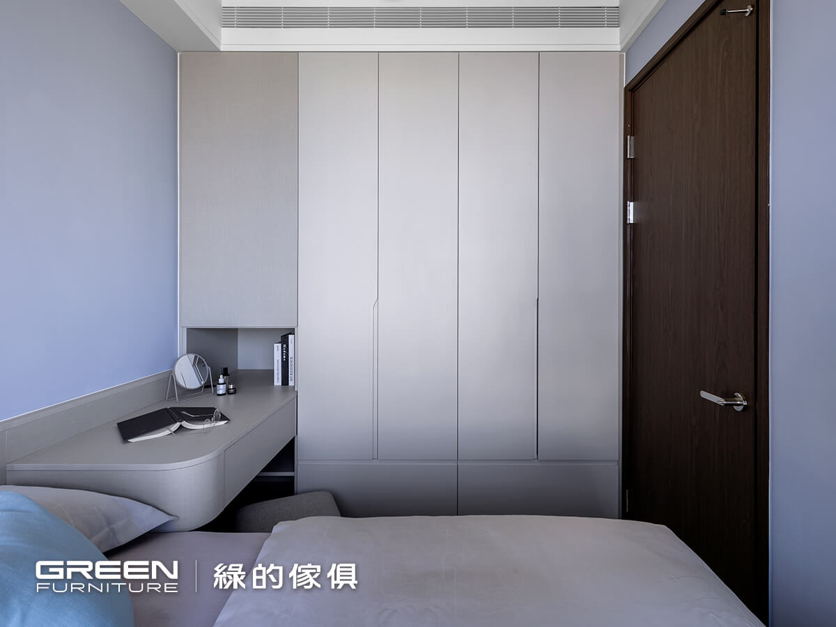 衣櫃則採滿版設計延伸至上方,同時配置升降式吊衣桿,不僅提升收納容量,也使高處空間仍能輕鬆取用,在實用性與便利性之間取得平衡。書桌則採懸浮+圓弧收邊設計,在使用上更為安全,也柔化整體線條,使空間氛圍更顯輕盈,透過色彩與材質的搭配,使女兒房在機能之外,也保有一種安靜而細膩的空間表情。