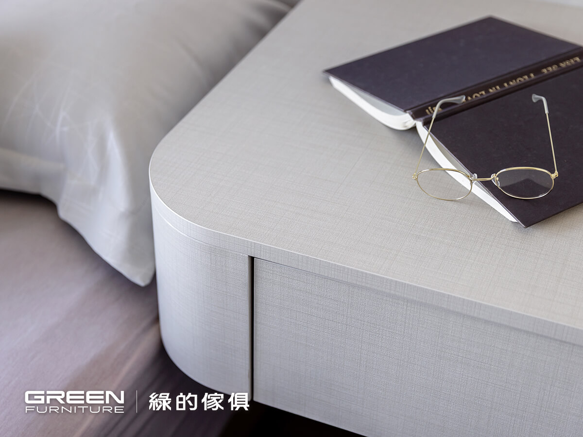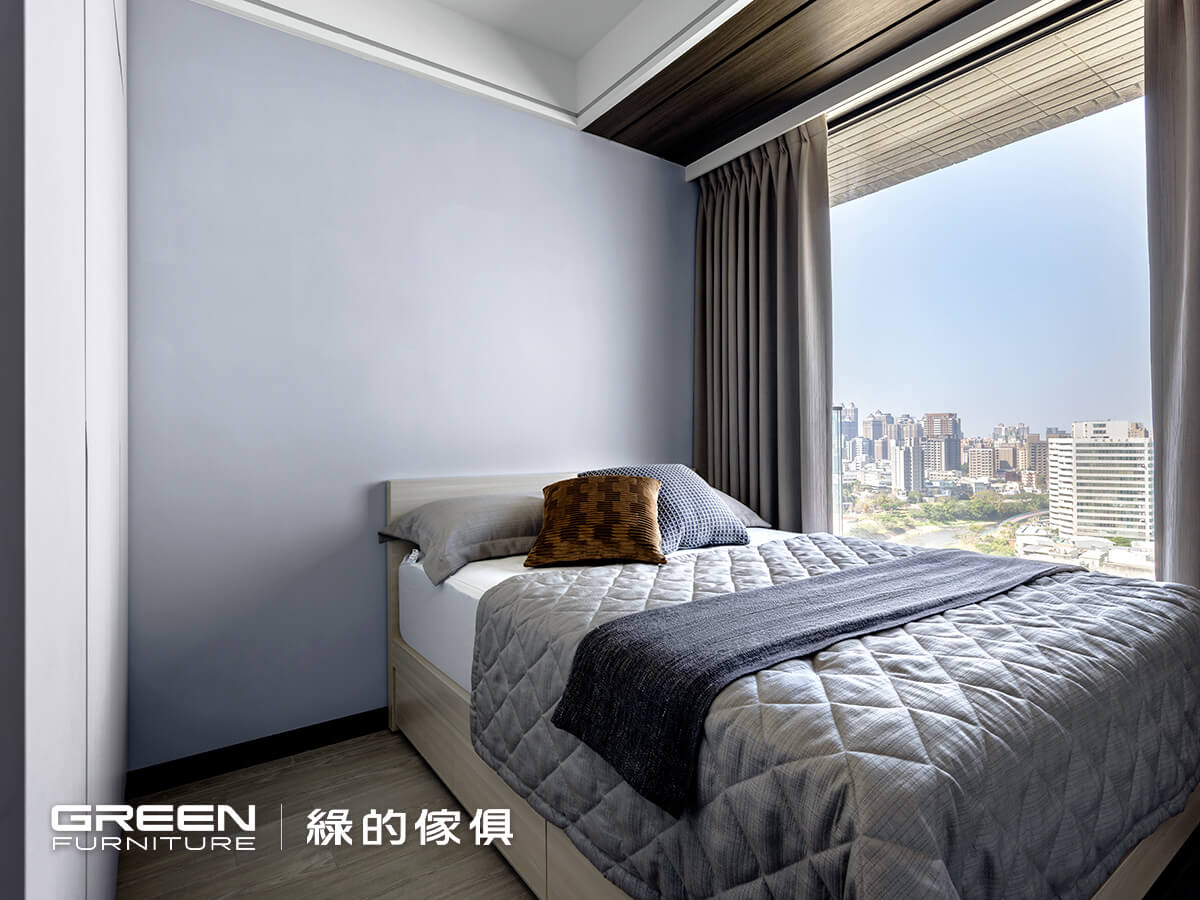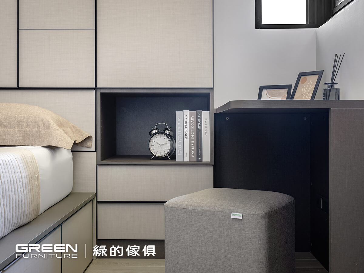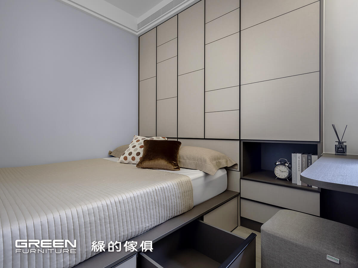 顧及床壓樑的風水問題,將衣櫃配置於床頭前方,既可化解疑慮,亦可將空間精準利用。同時以系統板材訂製床架,專門於下方設置三個抽屜櫃,在不增加量體的情況下提升收納機能,使衣物與生活用品都能有序歸位。書桌則以電競使用情境為出發,透過圓弧收邊與側邊深度的調整,減少使用時的碰撞,也柔化直角帶來的銳利感,使整體更顯輕盈。在有限的空間裡,透過整合式規劃,將收納與使用自然融合,也更貼近使用者的日常節奏。
