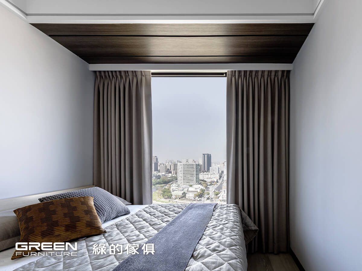 值得一提的是,將樑柱以木作貼皮修飾,嚴選深褐木調收整視覺,使空間更顯穩定一致。在有限尺度中,透過材質與收納的整合安排,使主臥不僅具備機能,也維持安定的生活氛圍。