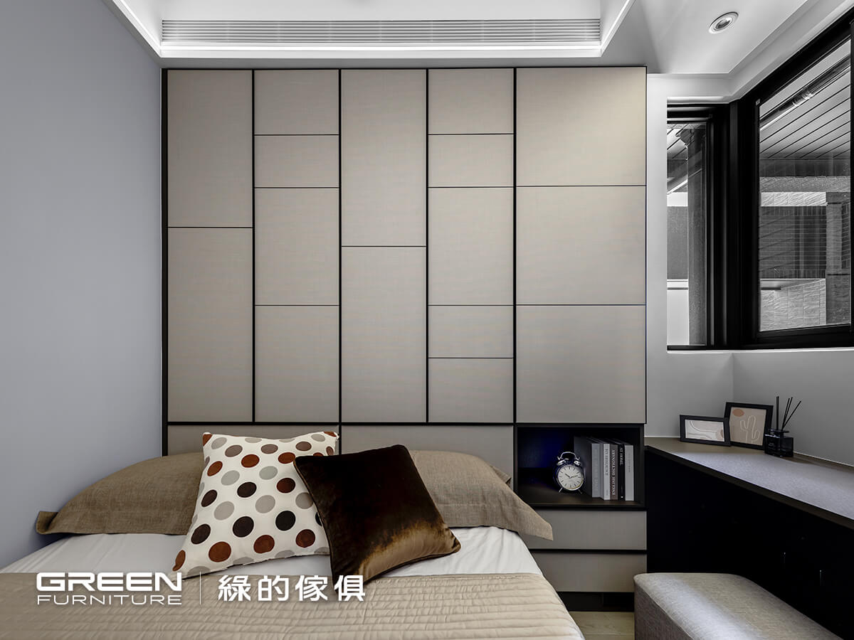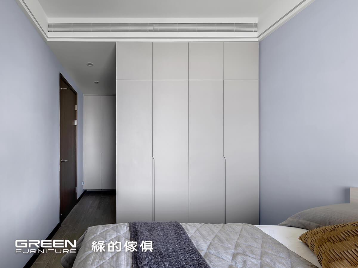 以淺炭灰色當作基調,搭配亞麻灰與羊絨皮革的系統櫃,透過相對純淨內斂的色調,使人在走進空間後能自然放鬆下來,回到最純粹的生活節奏。在收納規劃上,考量女主人衣物較多,因此將衣櫃採滿版設計延伸至頂,依序配置升降式吊衣桿,使高處空間也能輕鬆取用,符合收納習慣,也能減少堆疊造成的凌亂感,在使用上更為便利。