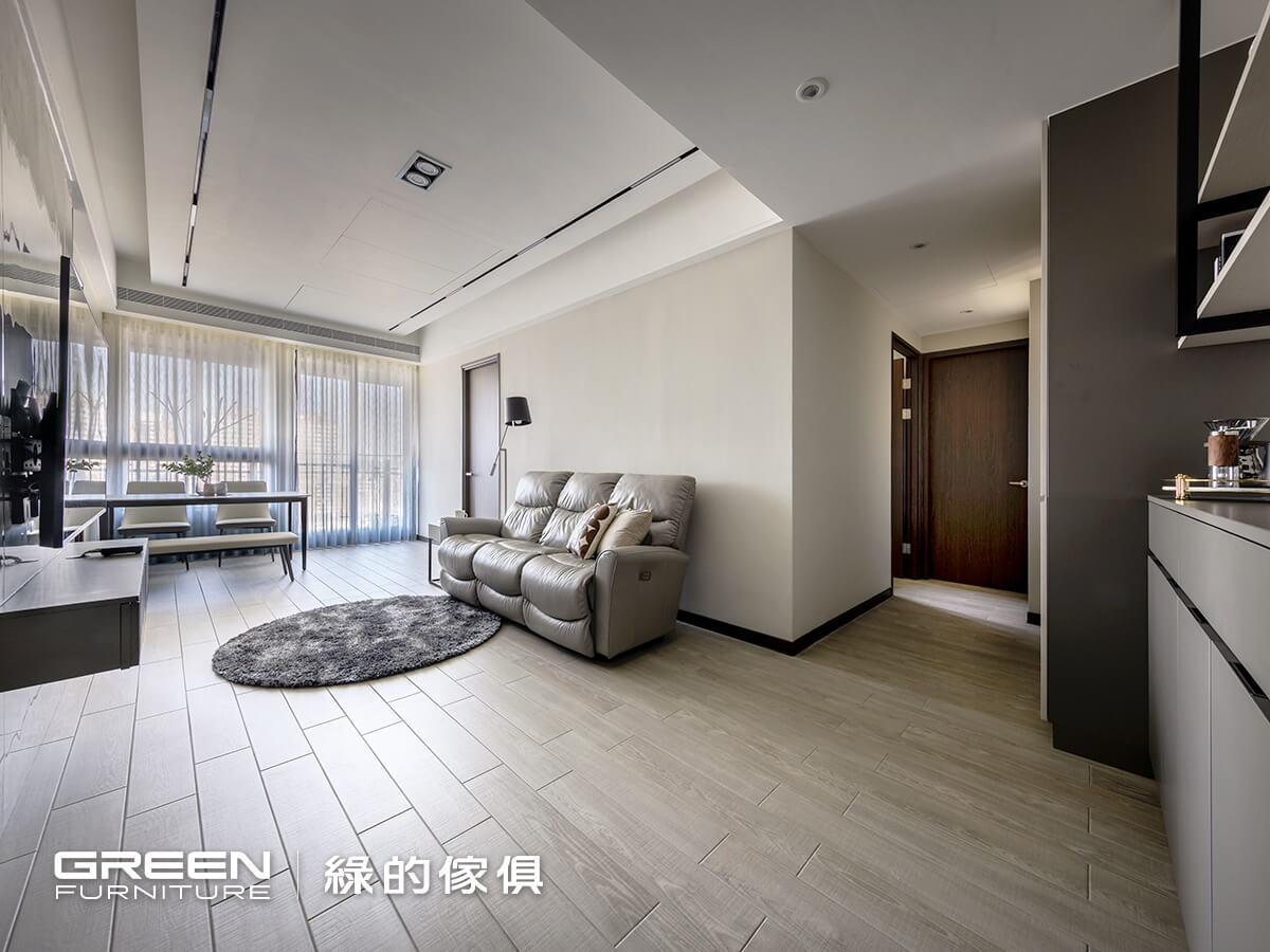 針對公領域設計,設計師表示:「本案的客廳格局與一般配置不同,電視牆並未設於陽台一側,而是落在中段走道位置,因此動線成為設計的首要考量。」由於沙發與電視之間的距離不到 200 公分,設計上將電視櫃縮短,並採懸浮式處理,維持走道寬度,亦可減輕量體帶來的壓迫感。屋主原先曾考慮擺放茶几或現成櫃體,但在 3D 圖模擬與動線評估後,最終選擇留白,使空間擁有呼吸感。