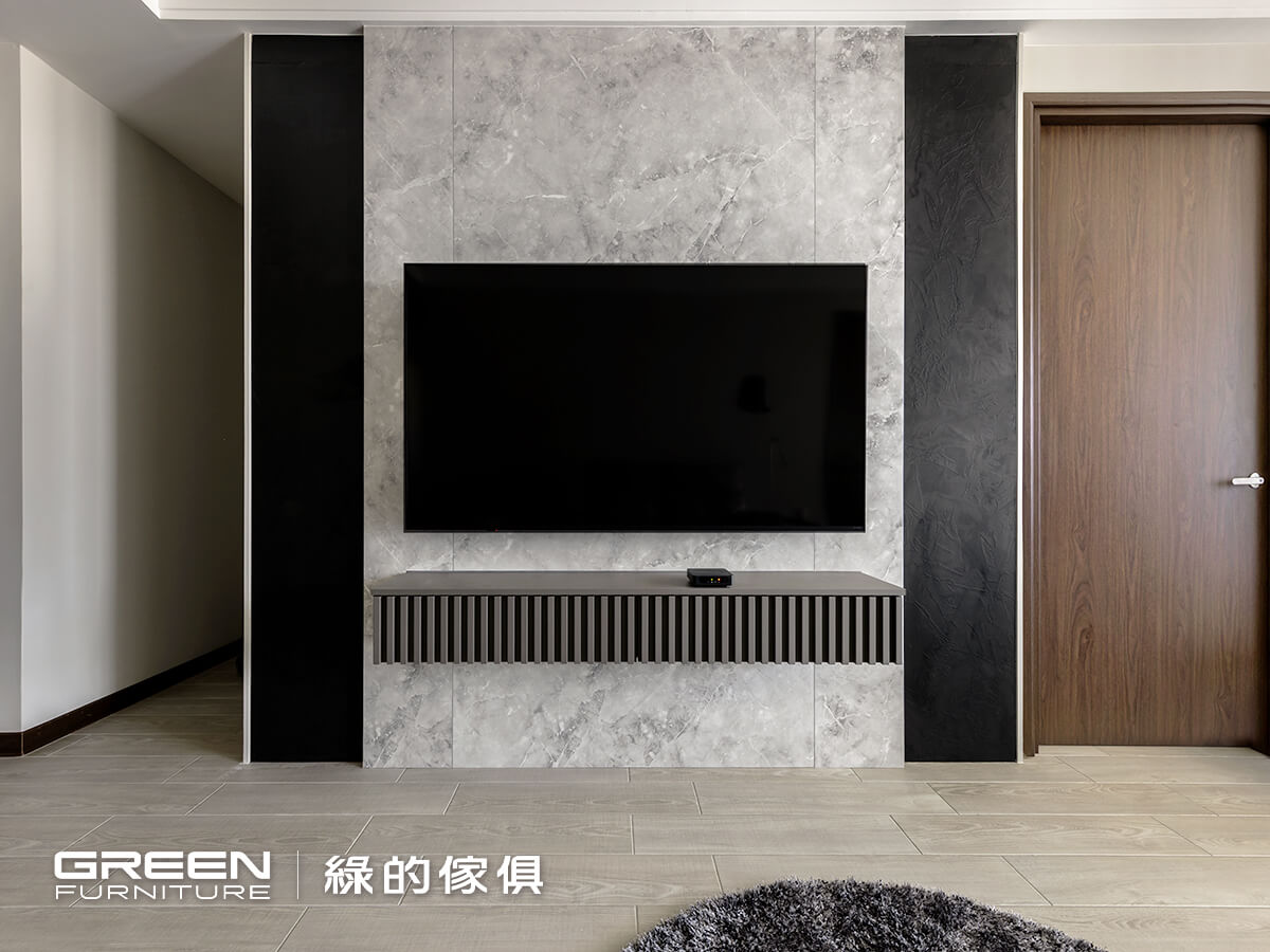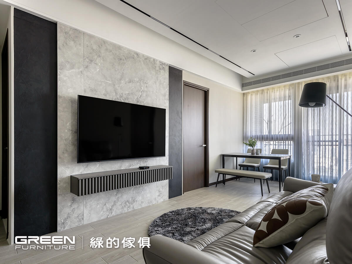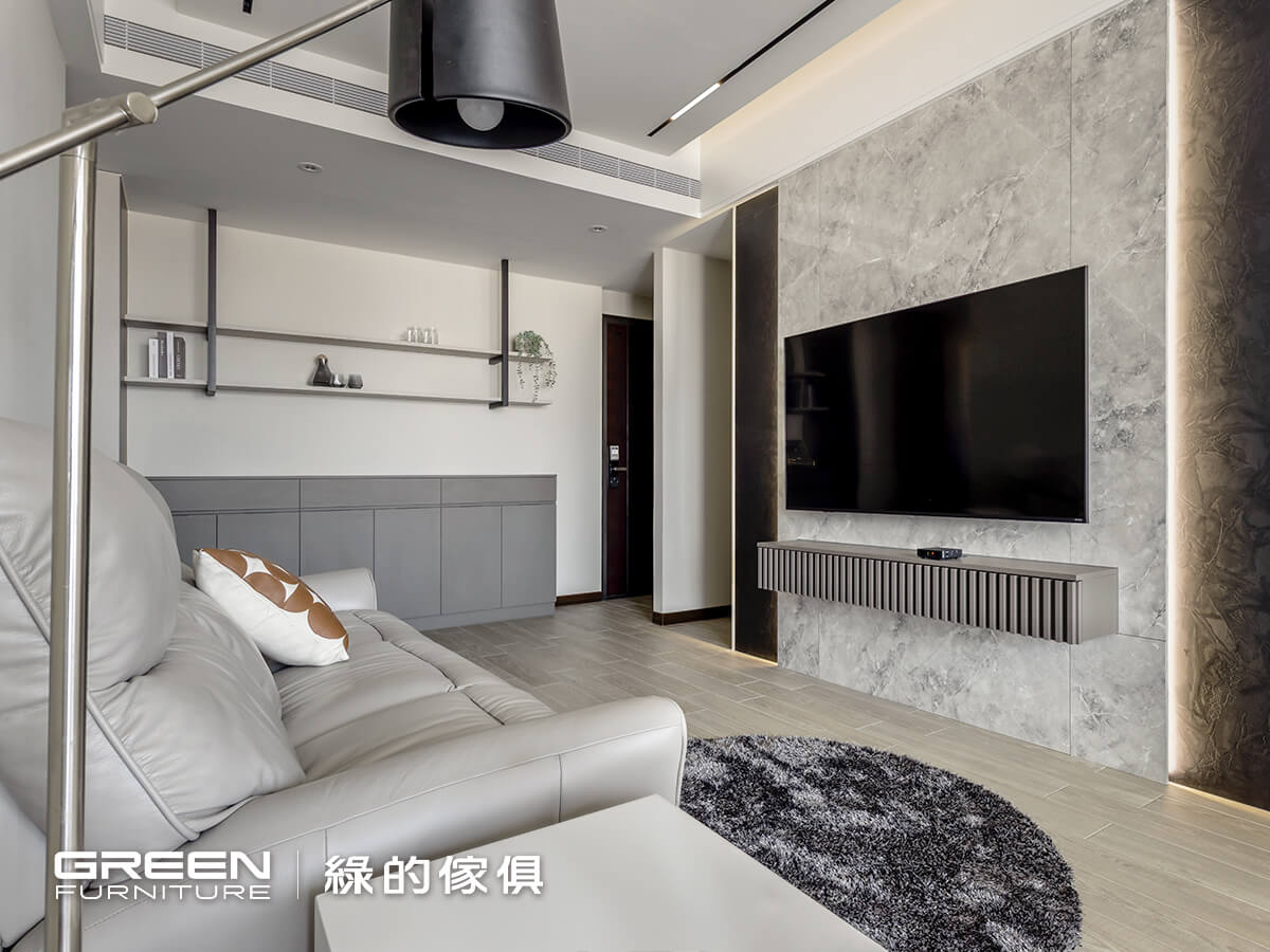 這間 15坪裝潢,以系統傢俱 作為空間的主軸,從一開始就把「好收納、好生活」放在最前面。櫃體全面選用 F1 等級低甲醛板材,讓家的空氣更安心;皮革質感、亞麻灰與深色木紋交錯搭配,再融入俐落的鐵件線條,讓櫃體不只是收納,更像是空間裡安靜卻有個性的存在。電視牆透過紋理與燈光的層層堆疊,讓視覺多了一點深度;磁吸軌道燈則保留了光的彈性,讓日常可以隨心調整。