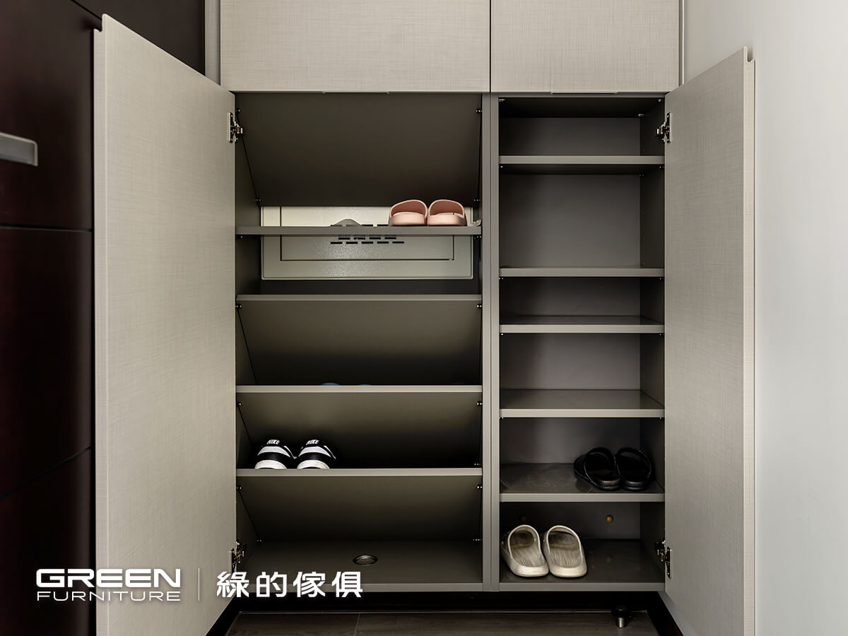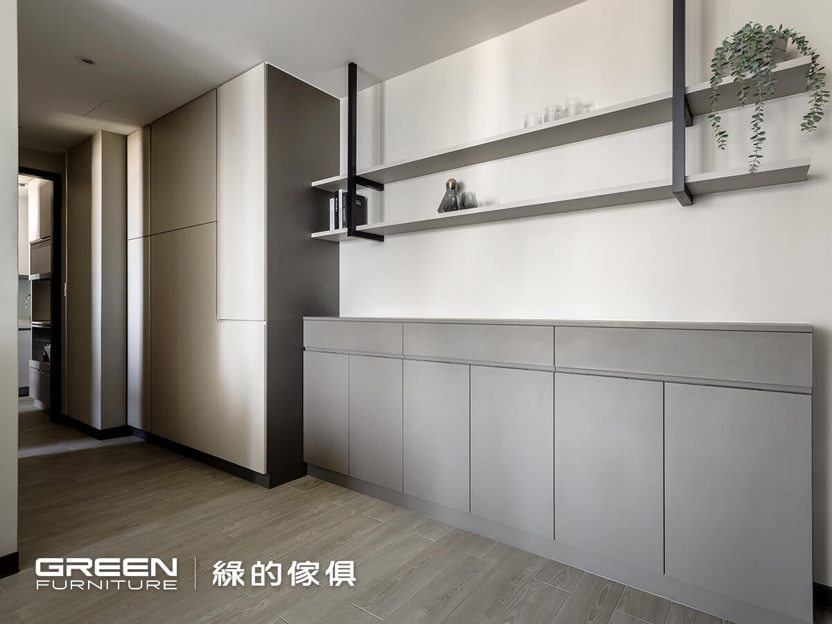 從櫃內開始,採用斜板層架設計,使鞋履無須擠壓也能妥善收納;櫃體上下則預留通風孔,搭配吊隱式空調系統維持空氣流通,減少氣味累積。門片採內凹設計,將把手隱於立面之中,而線條則成為設計元素之一,透過俐落走線勾勒出一份靈活律動感;依序仔細盤點收納需求,預留吸塵器、買菜籃與電器設備位置,使生活物品能有序歸位。此外,若以高櫃填滿玄關,將造成不小的壓迫感,因此以「鐵件方鋁管+1.8 公分薄板」搭起一道陳列架,使收納與收藏無須取捨,亦可減輕量體厚重。