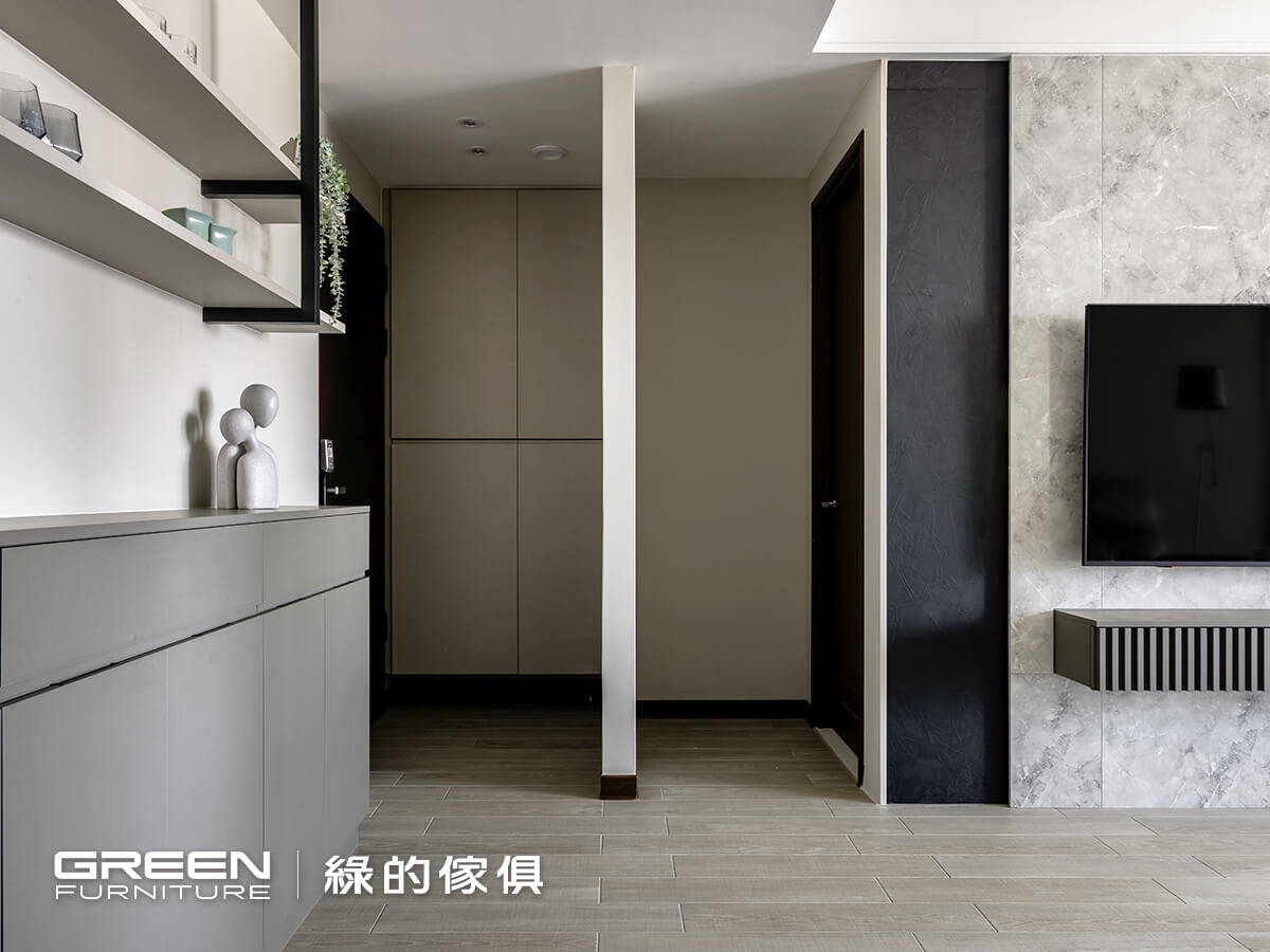 走進家門,玄關首先面對的是一項條件受限的收納規劃。在僅約 30 公分深度的空間中,須同時涵蓋鞋櫃與電箱機能。幾經思量後,設計師並未便宜行事,而是透過縝密配置化解僵局。