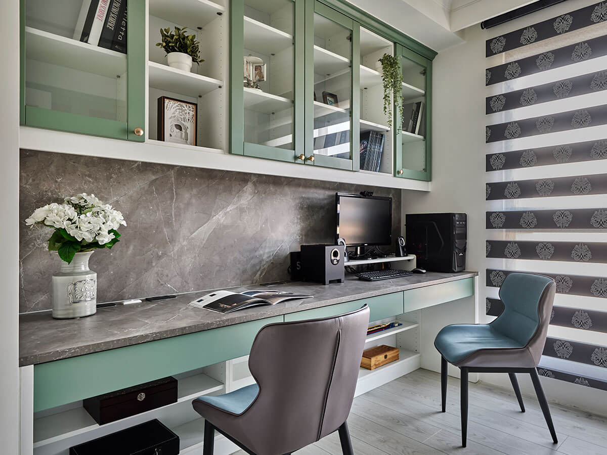 同步嚴選秋谷綠系統板材,引出蓊鬱蒼翠氣息,佐上一道雅典大理石板材,圍塑山野林間的自然情境,藉此平定浮躁的心,與此同時,貼心配置三張座椅,當兒女在書寫作業時,父母親也能一邊處理公事、一邊陪伴身旁的孩子們,無形凝聚融洽的親子關係。