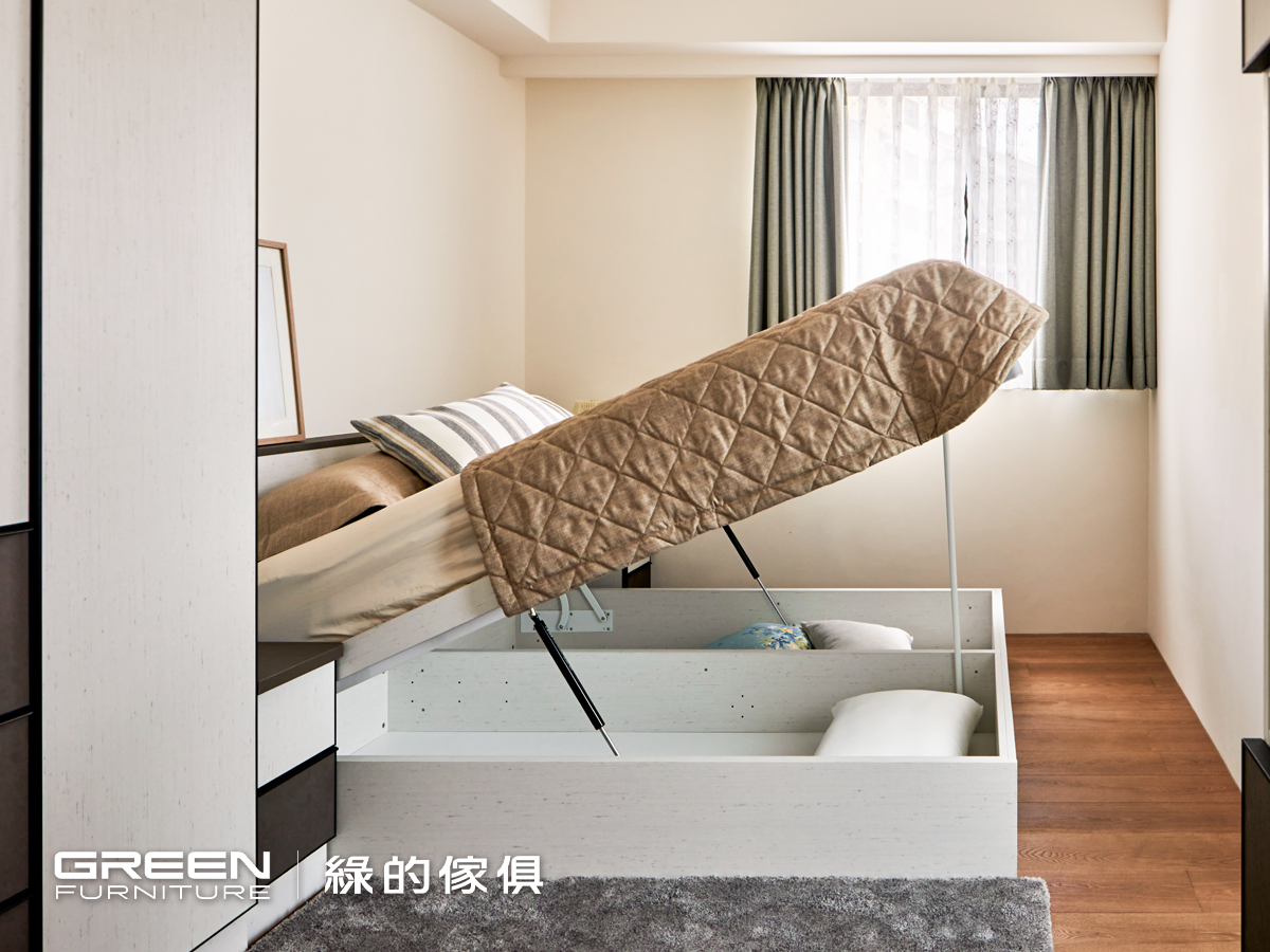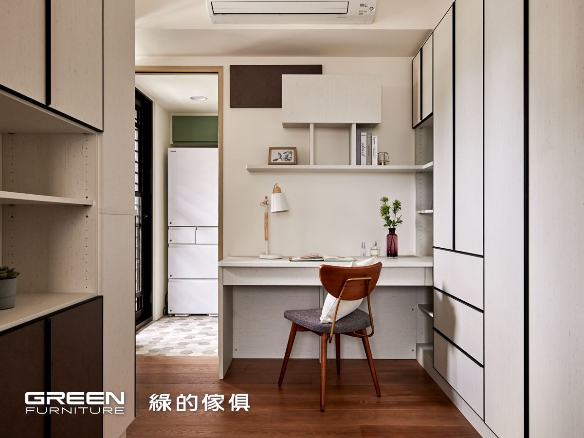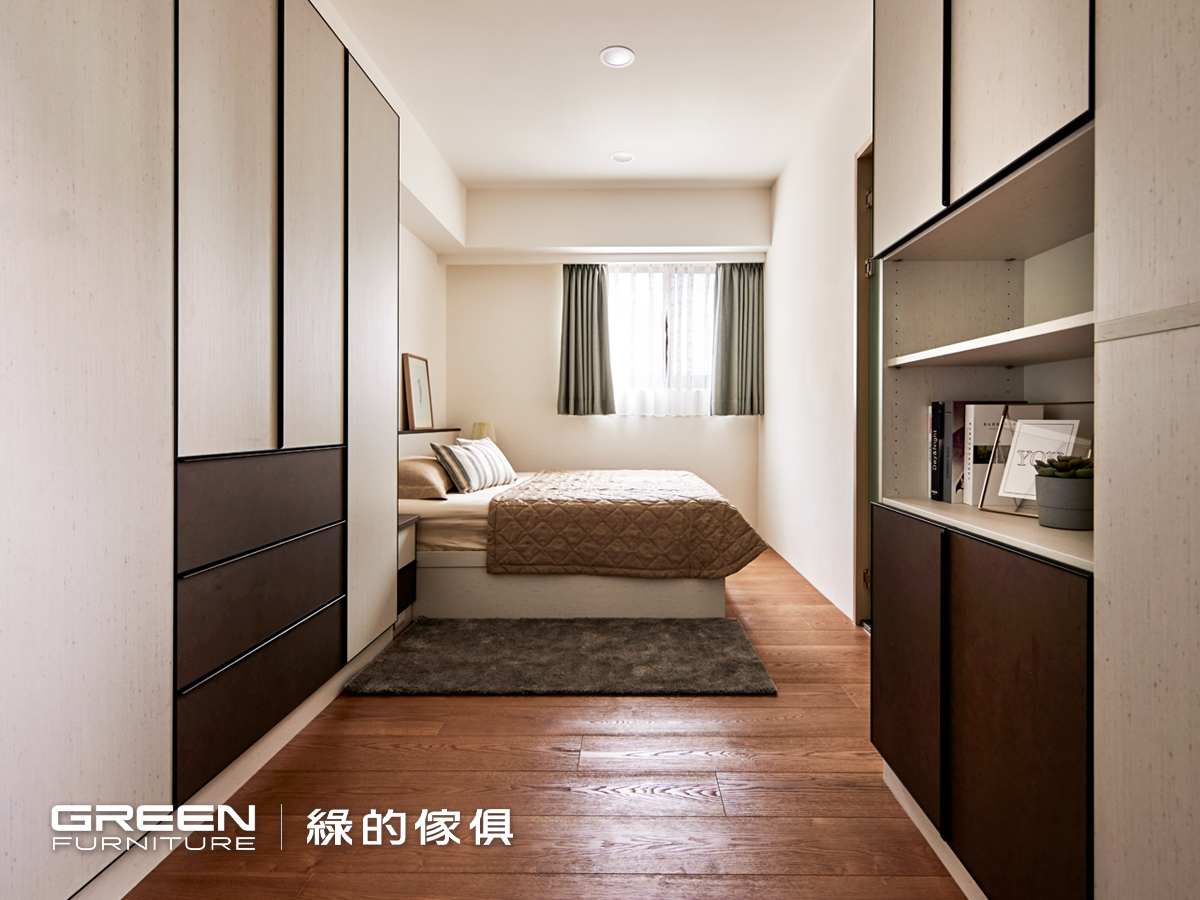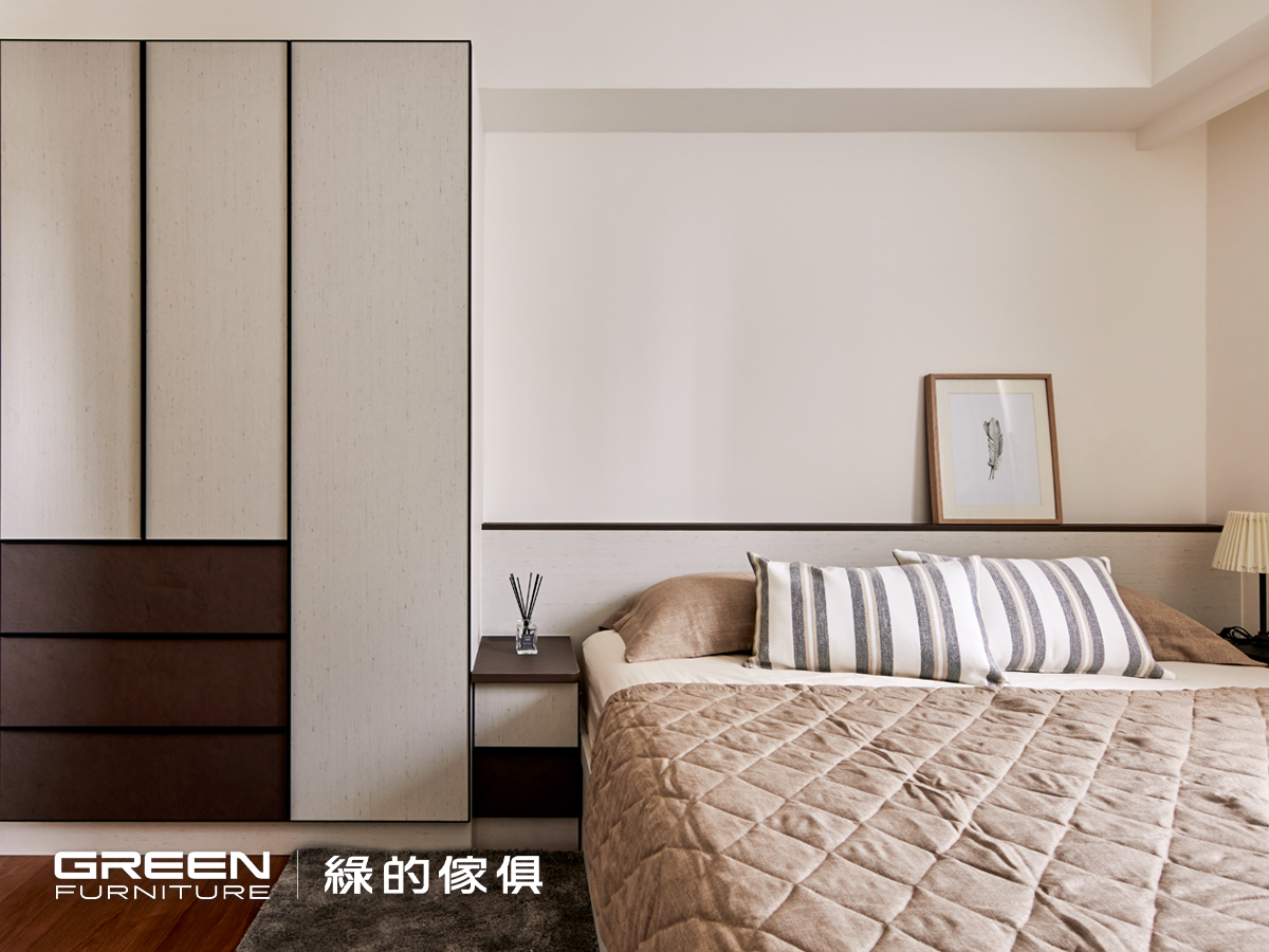 這個家的公共空間與私領域刻意做出風格差異,讓每個空間都有屬於自己的性格。走進私領域,整體以帶有織布質感的系統板材為主調,打造出更溫潤、安靜的休息氛圍。正對房門的櫥櫃運用局部簍空設計,有效減輕視覺壓迫,並讓光線更流動。整體系統櫃採用深淺雙色錯落搭配,在延續色彩主題的同時,也讓視覺更有層次變化。這樣的設計語彙,不只是為了美感,更考量日常使用的實際需求。每個櫃體內部都根據使用者習慣配置收納機能,讓衣物、寢具、雜物各有定位,而尾掀床的設計也成功放大了儲物空間,不浪費任何一寸坪效。這些精心安排的系統傢俱細節,不但展現綠的傢俱在整合式設計上的專業實力,也體現了屋主對生活品質的高度要求。