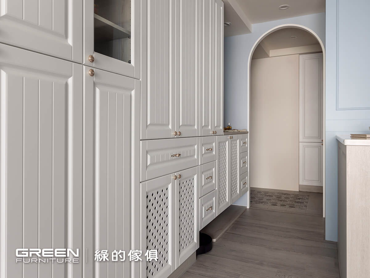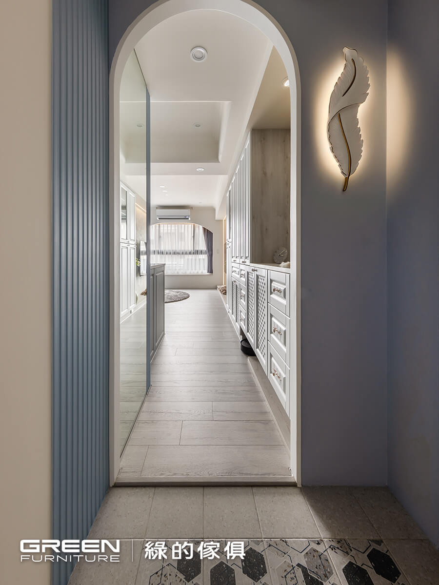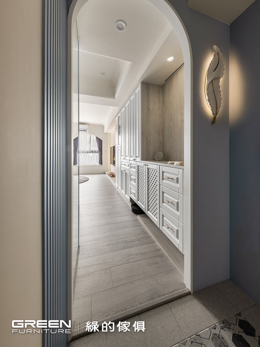 進口六角花磚鋪墊的玄關,豐富的拼貼效果,搭檔玄關拱門上的歐風羽毛燈,與落塵區檹角處的歐式鄉村風系統收納櫃及隔柵造型,形成最美的入戶端景,以精緻的現代法式迎接每個回家的人。菱格鏤空與線板兩種造型的系統門片,打造出鄉村風格的玄關櫃,搭配別緻的銀色雕花把手,門片材質特選白色烤漆,觸感細膩光澤溫潤更具耐污、易清潔等特性;如同空間裡一抹純淨的詩意,純粹中帶著細膩質感。