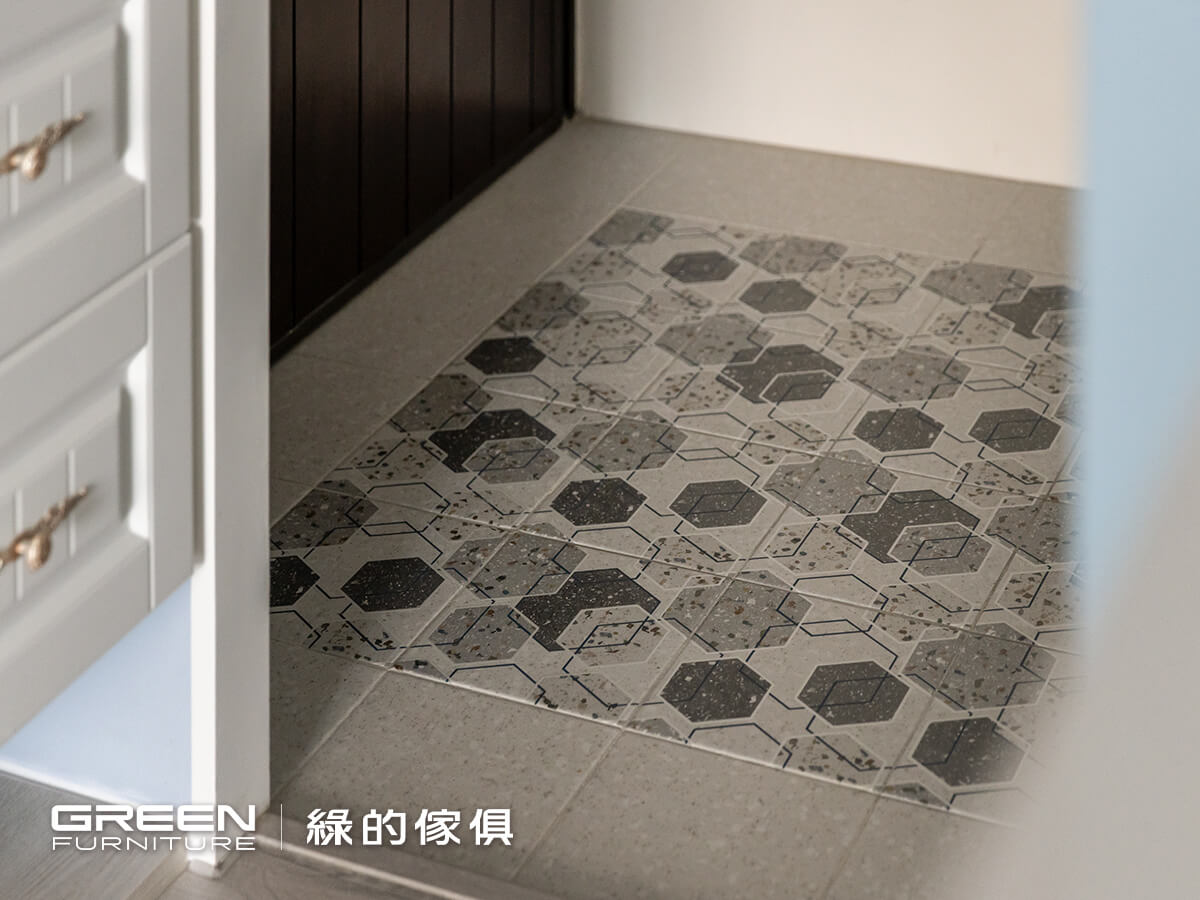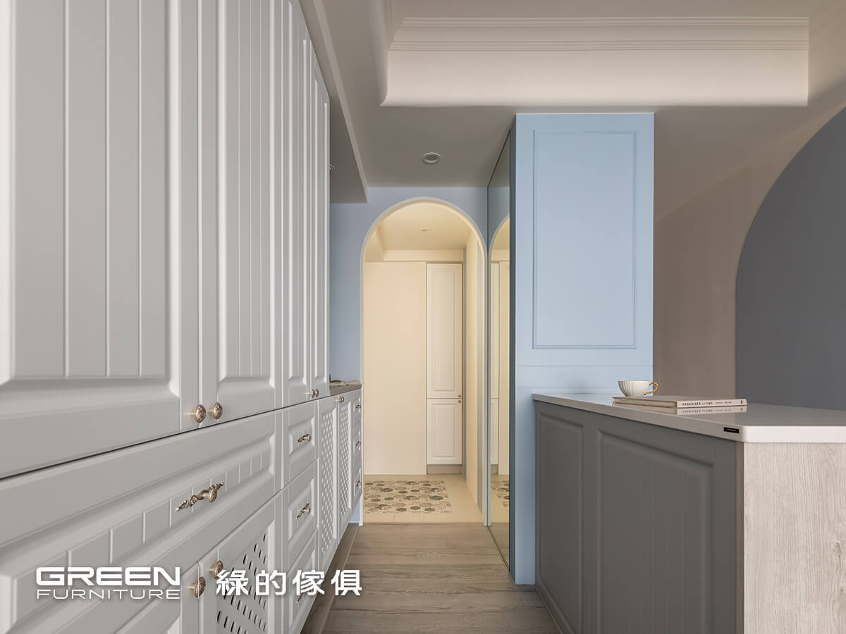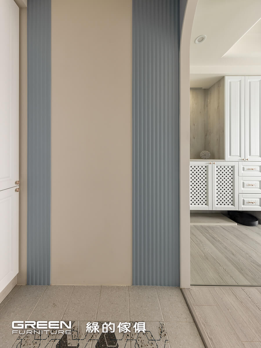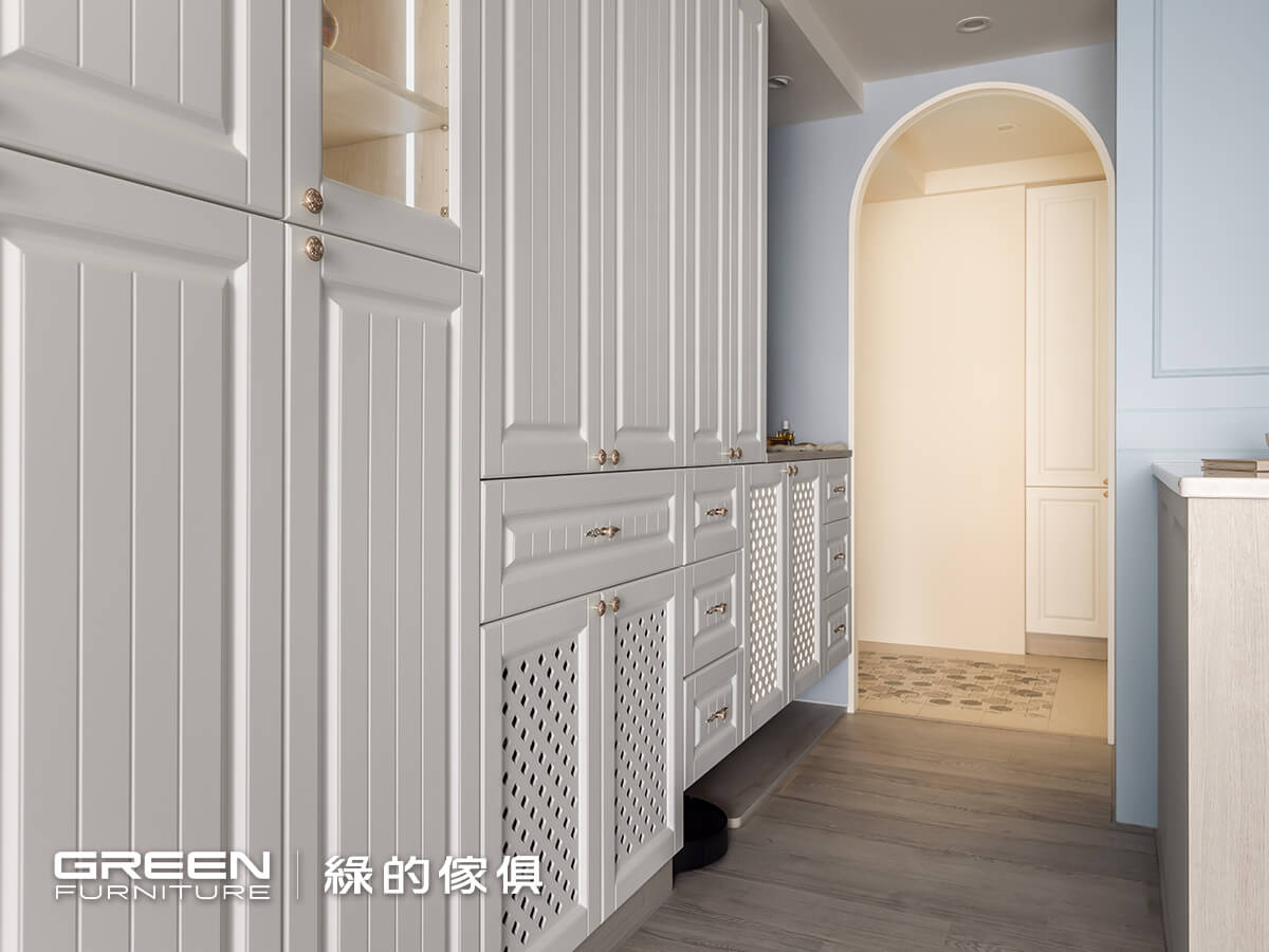進口六角花磚鋪墊的玄關,豐富的拼貼效果,搭檔玄關拱門上的歐風羽毛燈,與落塵區檹角處的歐式鄉村風系統收納櫃及隔柵造型,形成最美的入戶端景,以精緻的現代法式迎接每個回家的人。菱格鏤空與線板兩種造型的系統門片,打造出鄉村風格的玄關櫃,搭配別緻的銀色雕花把手,門片材質特選白色烤漆,觸感細膩光澤溫潤更具耐污、易清潔等特性;如同空間裡一抹純淨的詩意,純粹中帶著細膩質感。