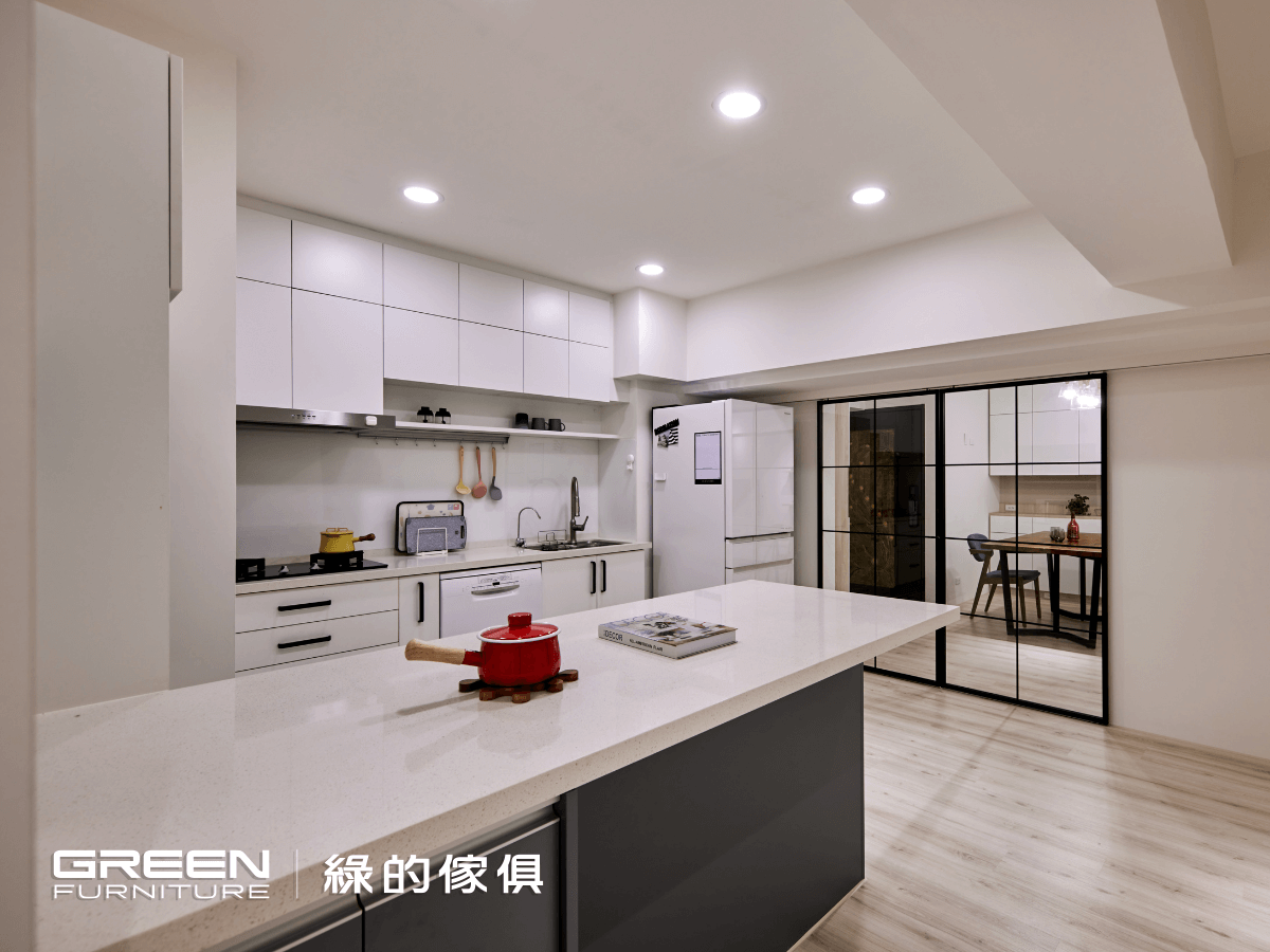 聊起最花心思討論規劃的空間,設計師與凌太太不約而同地指向廚房空間,當你拉開典雅的玻璃格子門,即可瞬間體會當中的用心所在。現如今闊綽舒適的料理場景,正是仰賴於雙方之間的堅持,卸下原有的廚具設備,憑藉系統板材的高度可塑性,沿著空間尺度與作業動線縝密配置。