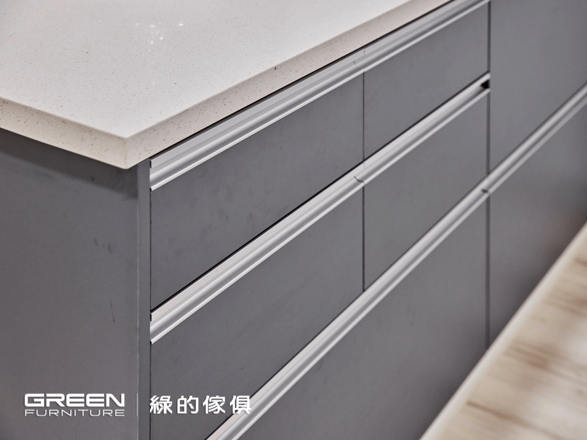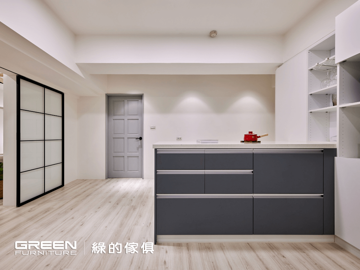 由於原屋主有調整過格局,導致現有空間出現諸多畸零角落,正好可以發揮系統傢俱的優勢,依循著凹槽分別填上電器櫃與開放格櫃,使小家電依次放置,而酒杯也能自成一道優柔光景,依序採用霧灰藍系統板材,推伸出一道中島吧台,仔細拿捏長寬比例,使其不影響動線又能大幅提升機能,同步裝設側拉櫃擴增收納形式,妥善收納各種生活雜物。