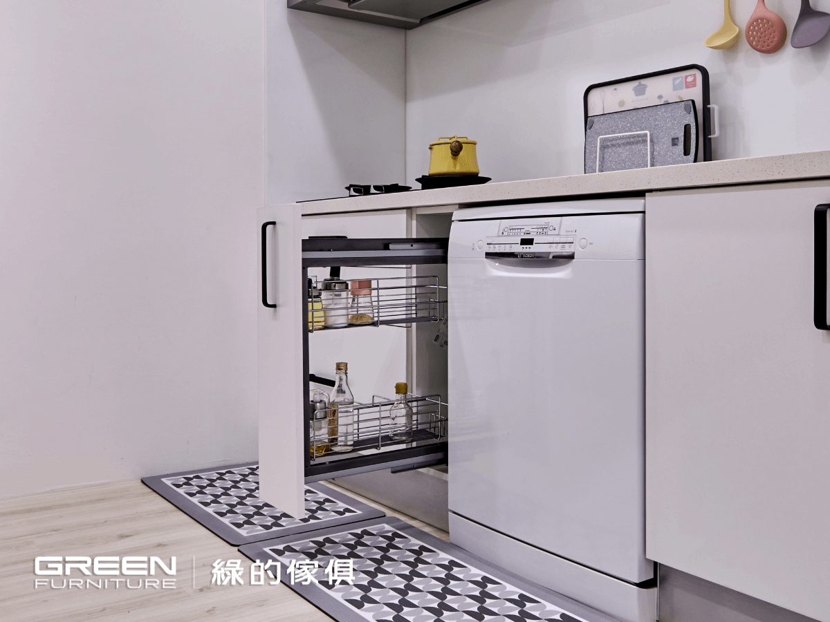 針對一字型廚具,以系統板材填築上櫃,搭配開放層板擺放常用的用具或食器,設計師接著細心指出,當時防濺牆是採用綠的傢俱的「超優白烤漆玻璃」,別於一般常見的淡綠色,以純白色調降低突兀感,同步配置「易利勾」與「側拉抽屜櫃」有序收納瑣碎的烹飪用具。