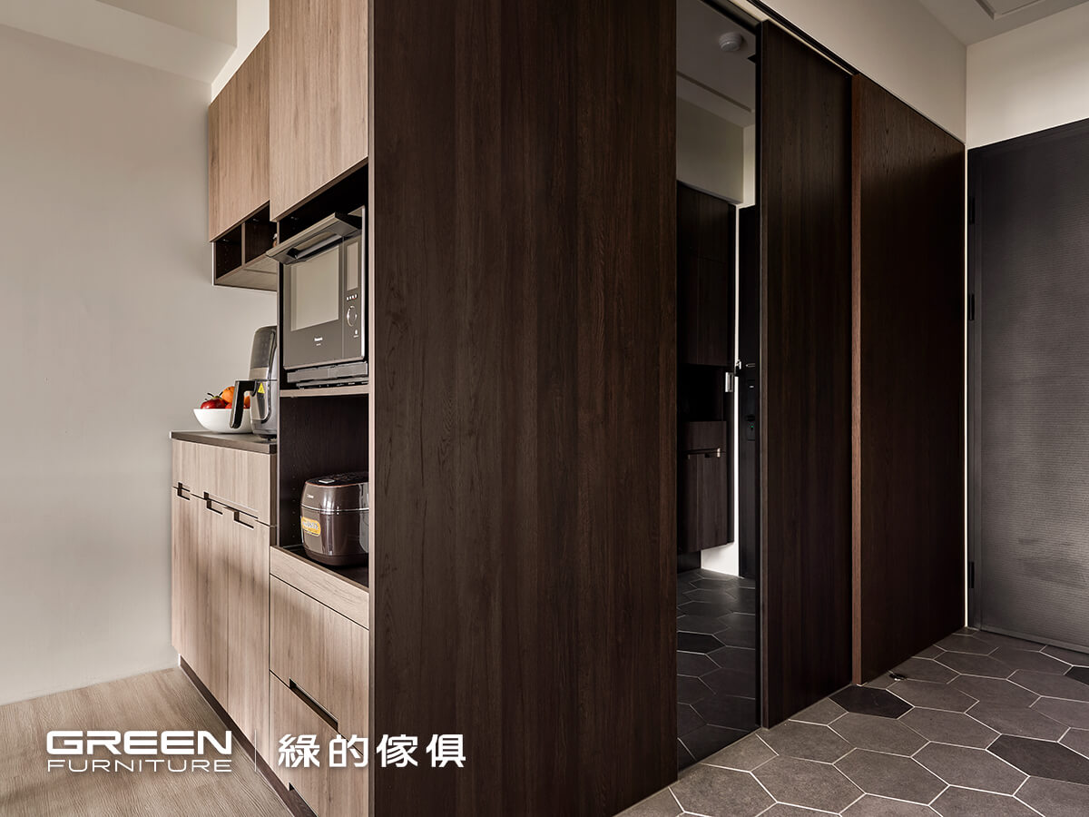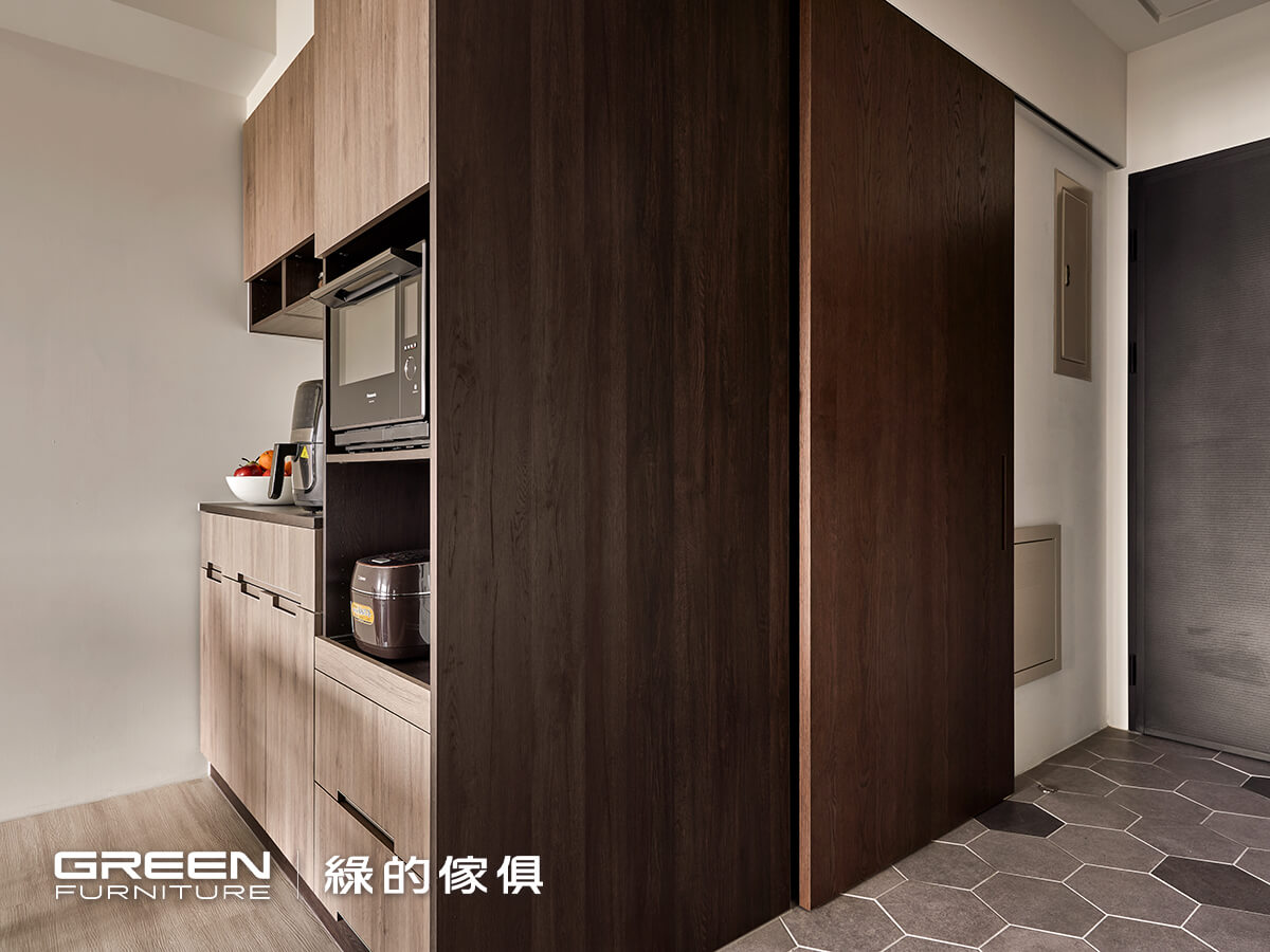 進屋左側就是靠牆而立的懸浮式鞋櫃,不僅清潔上更為方便,也能置放拖鞋等其他物品,為了區隔落塵區和室內空間,除了利用地坪高低差之外,玄關地板使用石紋磁磚做點綴,進屋就能感受到屋主獨特的品味,設計師選用泥橡為主要櫃體色,一路延伸至客、餐廳空間,放大整個公領域的視覺效果,藉由通透明亮的採光達到寬闊的平面視野;以推拉門的設計遮蔽進屋右側的變電箱,日後維護都不需要拆除任何的掛桿或層架,使用上更為順手方便。