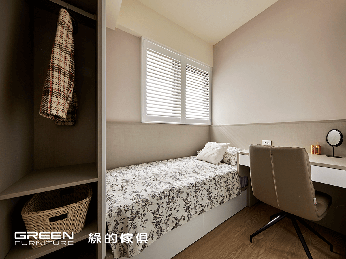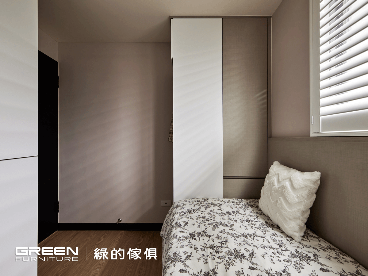 這是女主最喜歡的空間,讓她覺得很舒適。由於原來的景觀窗不適合置放床架,因此先以木作封窗,再以亞麻灰系統板封牆,以便置放抽屜床,搭配的紫藕色的背牆則是女主喜歡的顏色。床側面連結書櫃、衣櫃,並搭配全身鏡。床尾撞色的收納櫃則充當床頭櫃,側面則是汙衣區。