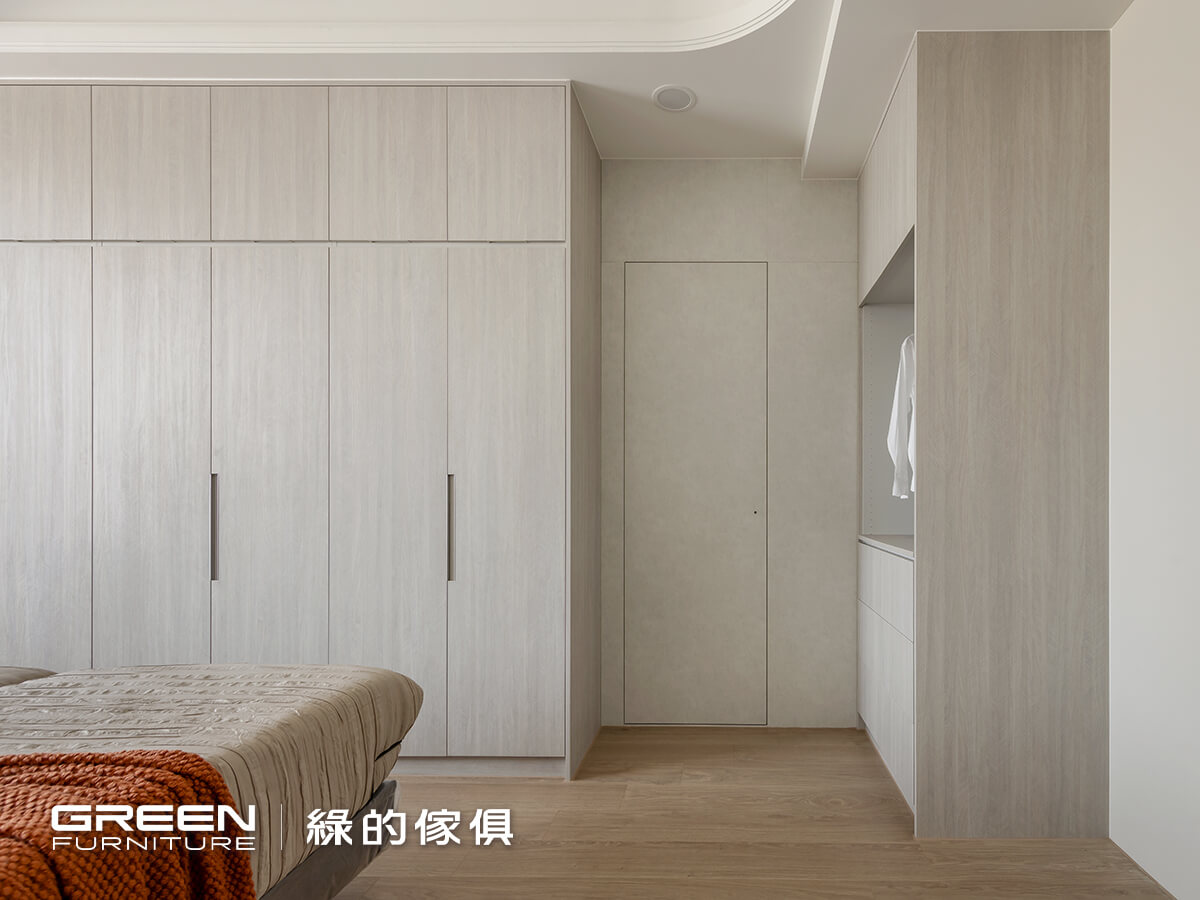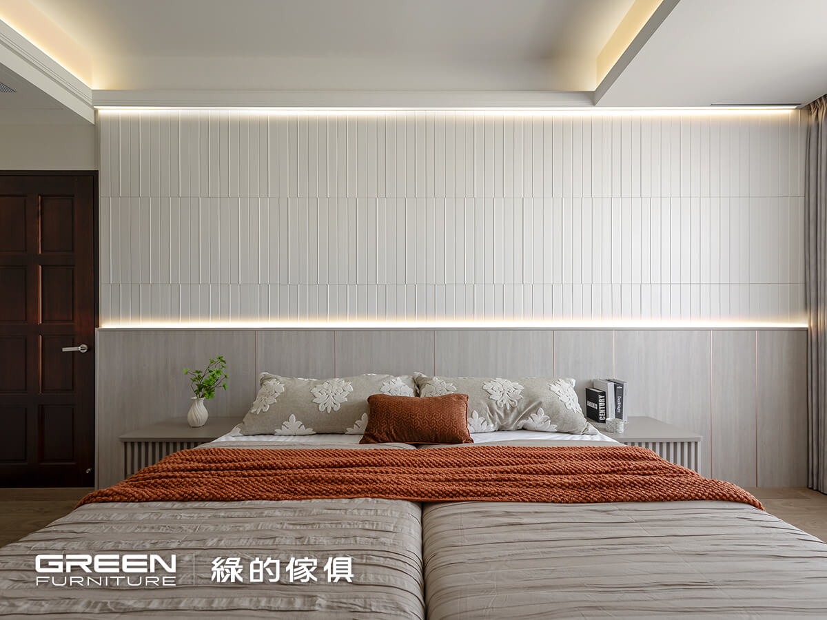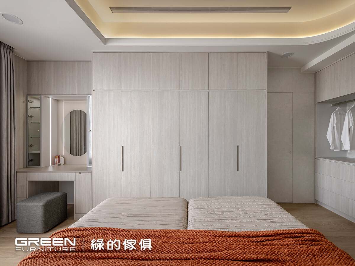 主臥以淺色調與不同明度的連續色塊整合空間,床頭訂製皮雕板可替換顏色與造型,讓空間隨時間與心境而變化。系統衣櫃與化妝桌一體成型,機能與美感兼具;天花板及床頭板設置間接照明,營造出舒適的睡眠氛圍。