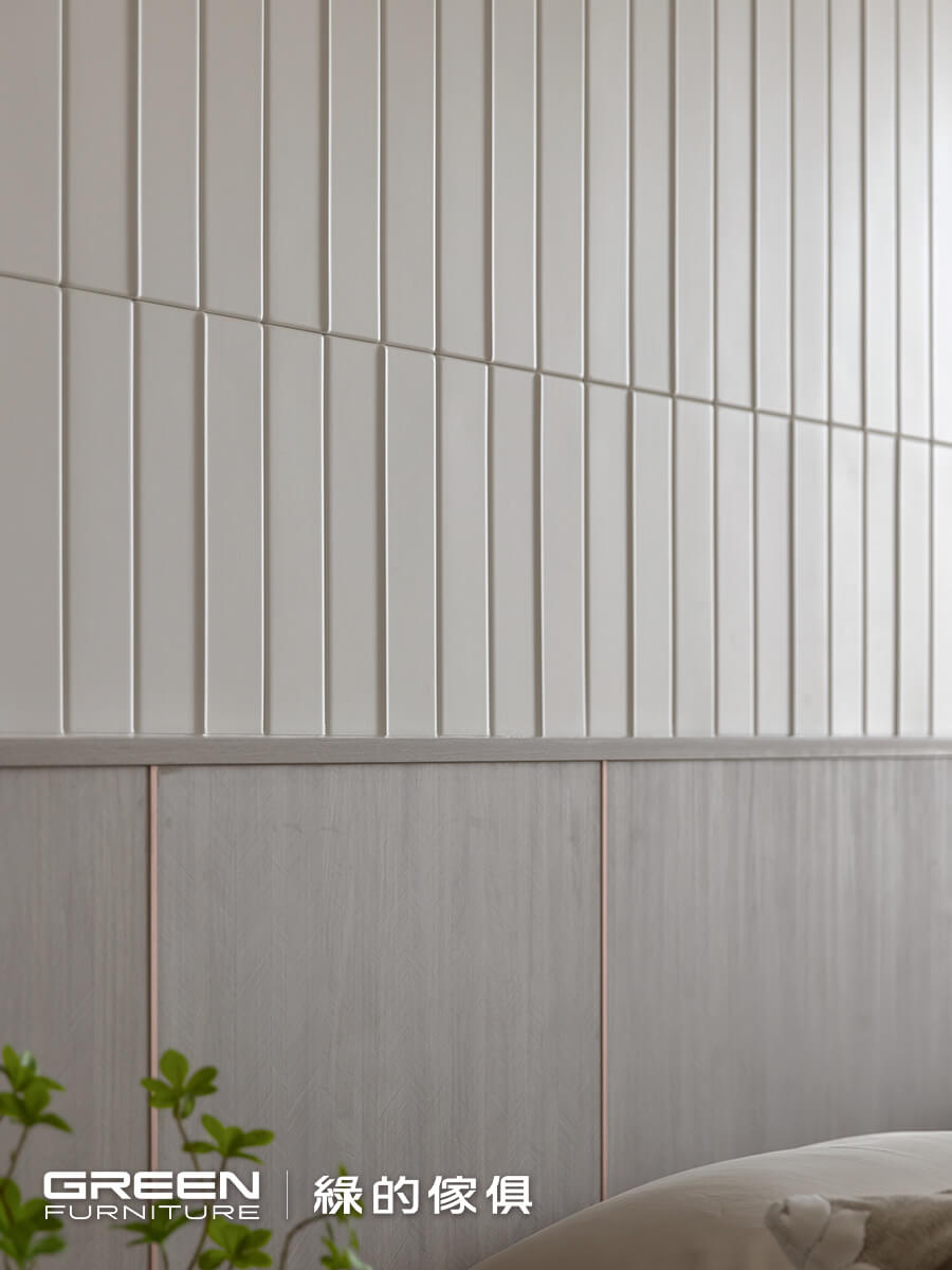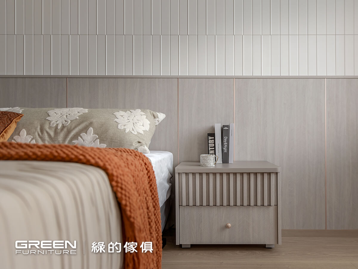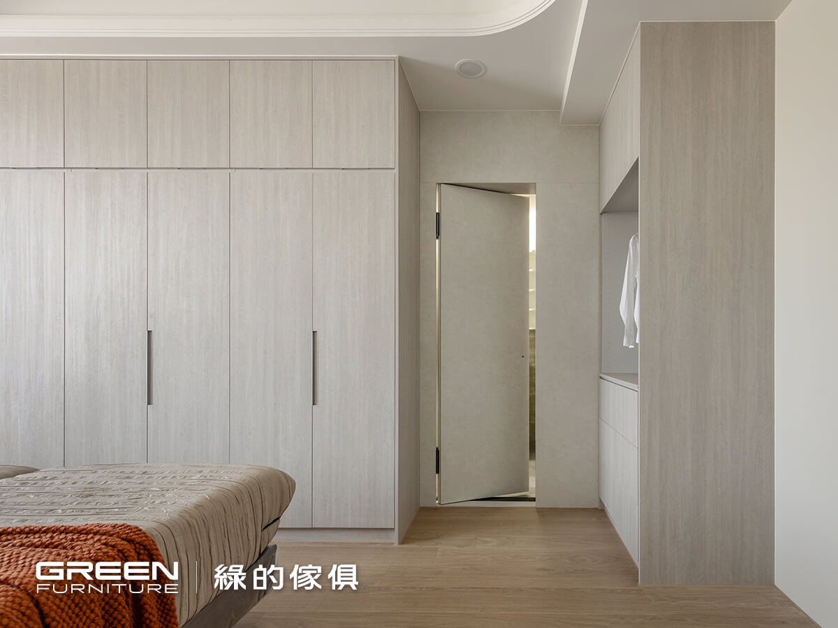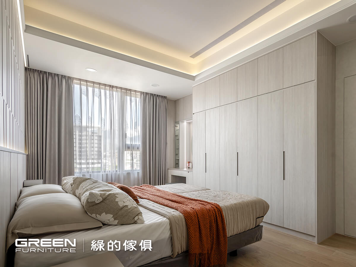 主臥以淺色調與不同明度的連續色塊整合空間,床頭訂製皮雕板可替換顏色與造型,讓空間隨時間與心境而變化。系統衣櫃與化妝桌一體成型,機能與美感兼具;天花板及床頭板設置間接照明,營造出舒適的睡眠氛圍。