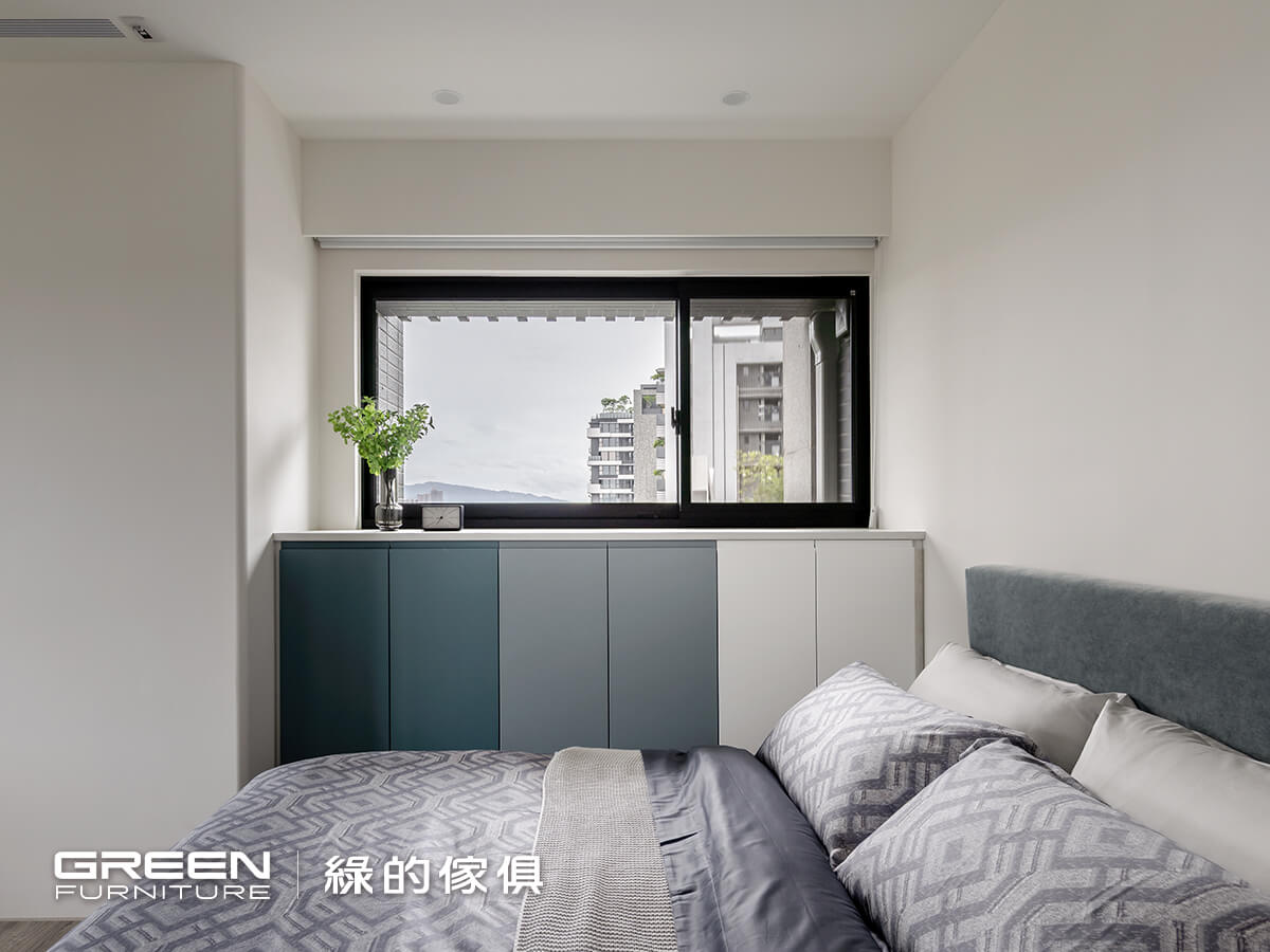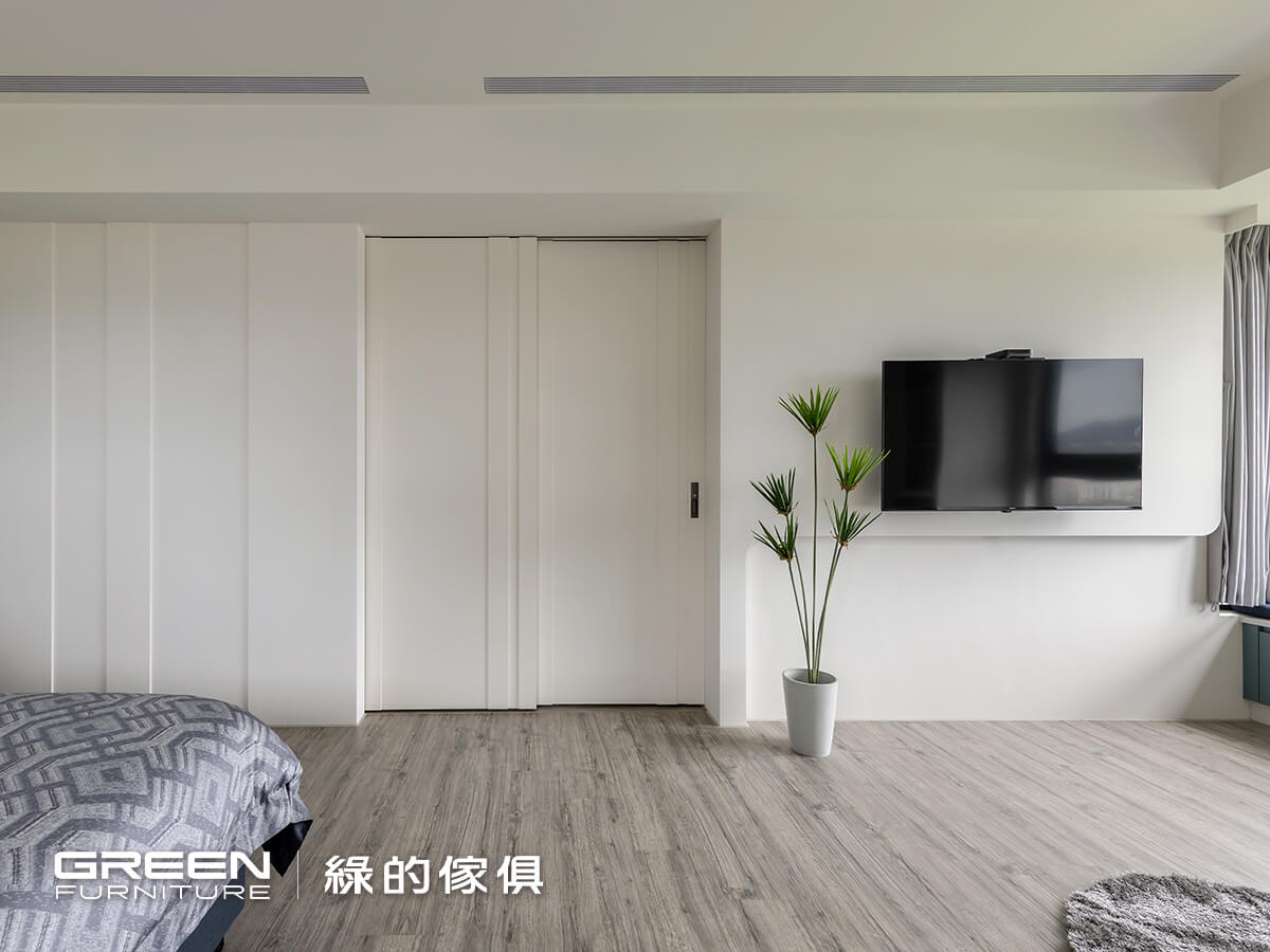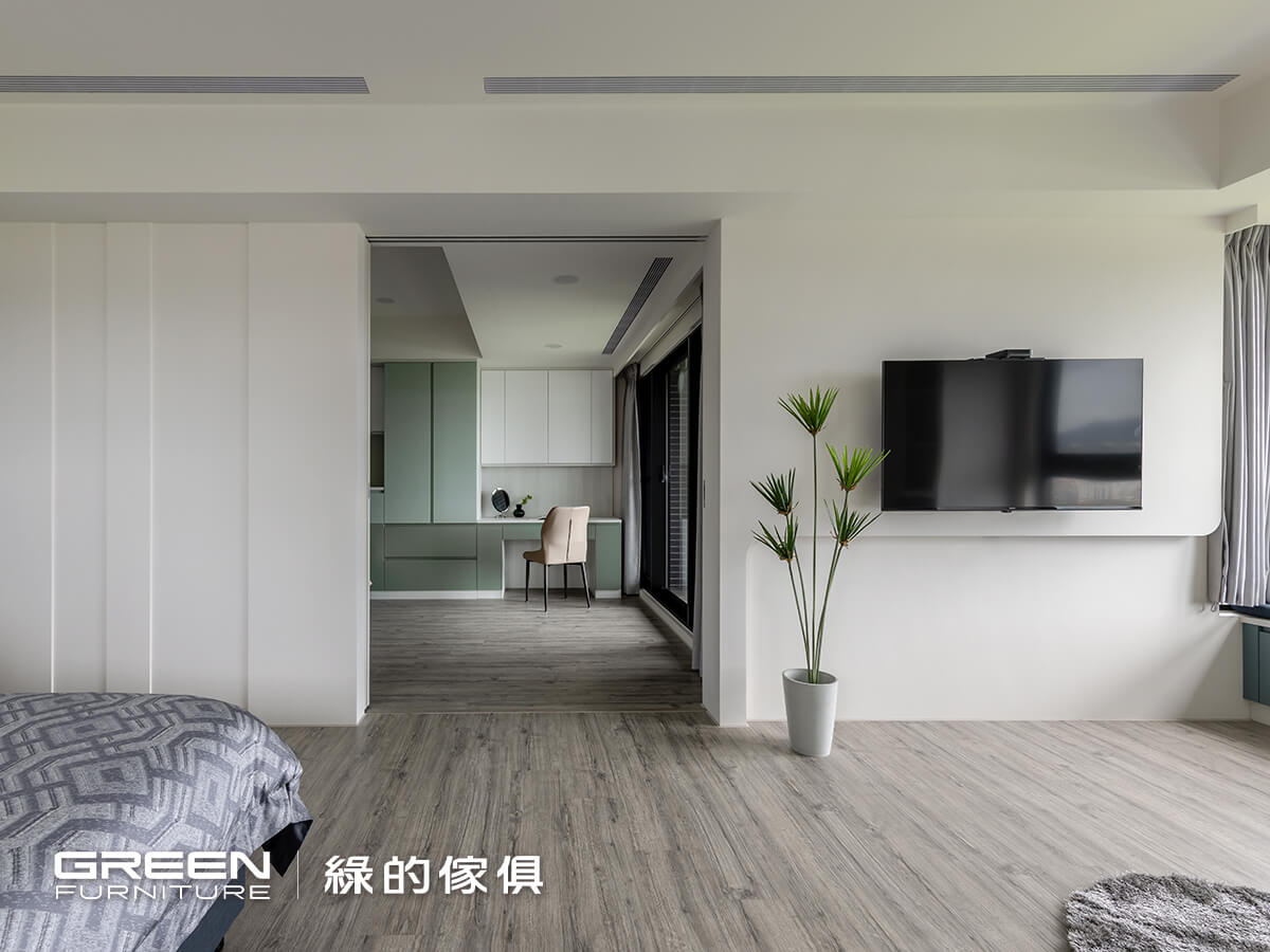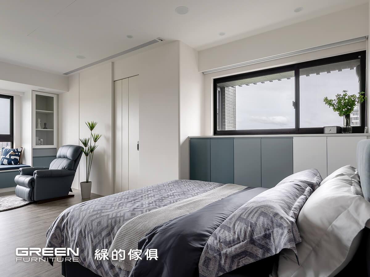 為了可以容納四季衣物,在規劃臥室系統櫃配置時,以好整理、大收納為核心,臥室空間的系統門片皆為烤漆門片,兼具色彩細膩及好清潔擦拭的特性,兩間獨立主臥室的床頭櫃、衣櫃等色系一致,在視覺上更顯柔和及整體性的美感,因系統傢俱高訂製的特性,更能靈活運用每個空間 。
