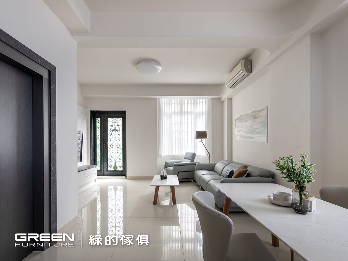 機能規劃上,設計師將便利隱藏於無形。系統餐邊櫃採取貼牆垂直整合,從玄關延伸至餐飲區,提供驚人容量並維持立面平整。通往廚房處設置霧面玻璃推拉門,阻隔油煙同時不切斷光線流動。讓屋主在忙碌的一家四口生活中,依然保有「伸手即得」的俐落與優雅。