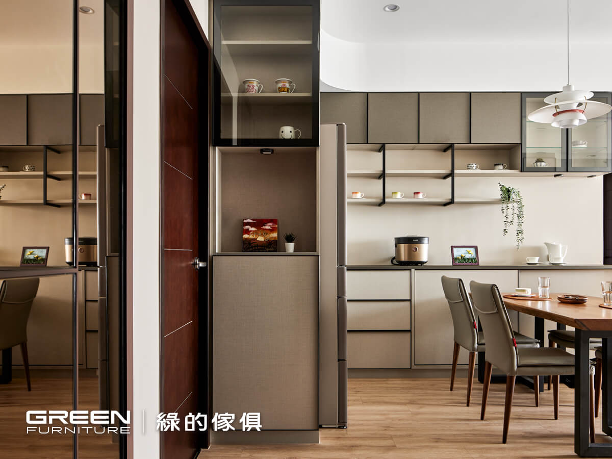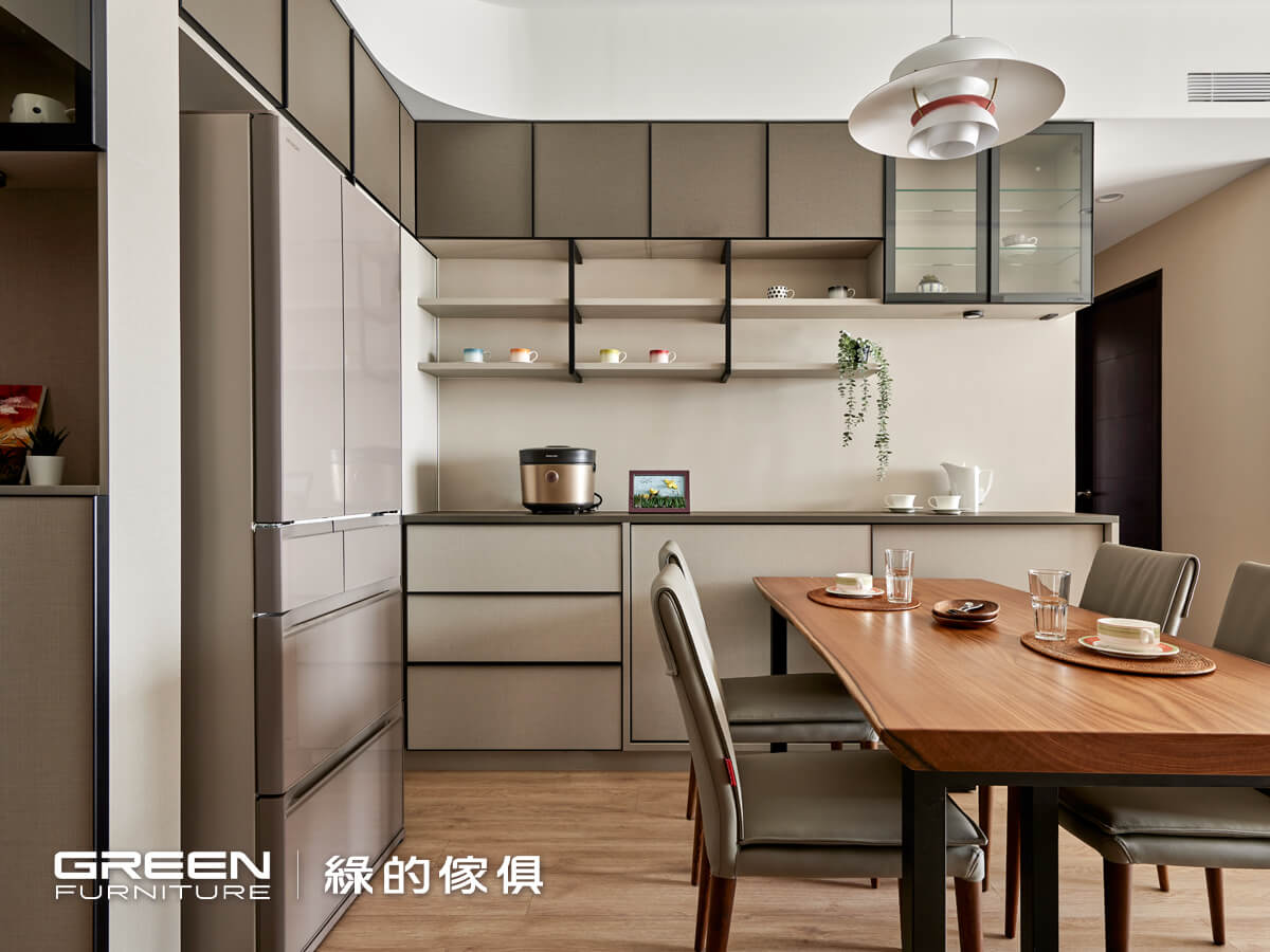 亞麻灰搭配黑五金手把框的L型櫥櫃,一直延續到白色冰箱上方,以較為深色的質材與其產生對比。餐廳與廚房的銜接與緩衝,由半開放櫥櫃以黑五金手把框搭配亞麻灰門片,延續餐廳的色彩。