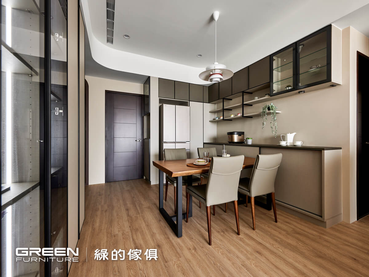 餐廳設計依舊延續室內的簡潔風格,由於餐桌一側靠著櫥櫃而立,櫥櫃採用滑櫃式拉門,方便取物或收納。櫥櫃檯面是鈦絲褐板材,櫃門則是黑五金手把框搭配亞麻灰門片。屋主對餐廳設計有其特別要求,餐廳是家的重心,家人回到家吃飯,都聚在餐桌,希望可以舒舒服服。「綠的傢俱」胡桃系列皮質餐椅,水曲柳實木的椅腳,餐椅高度也依屋主喜好與習慣做了適度調整,與原木餐桌互相搭檔,就是家人相聚最安心舒適的空間。