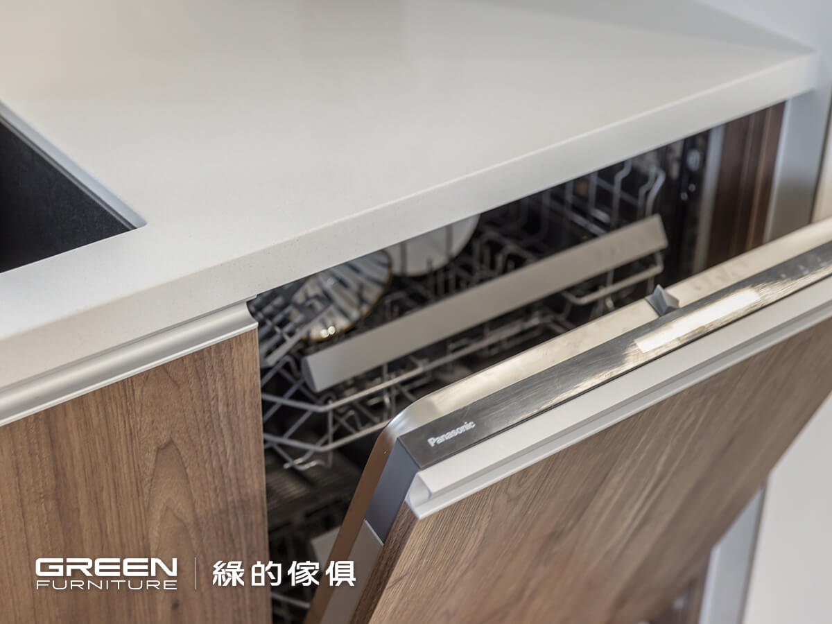 廚房在規劃的首要考量就是烹飪動線的流暢度以及足夠的工作檯,ㄇ字型廚房檯面使用 耐磨石英石,硬度高好清潔、不易染色;防濺牆選用 日本原裝 AICA 防火板,耐高溫且清潔方便。