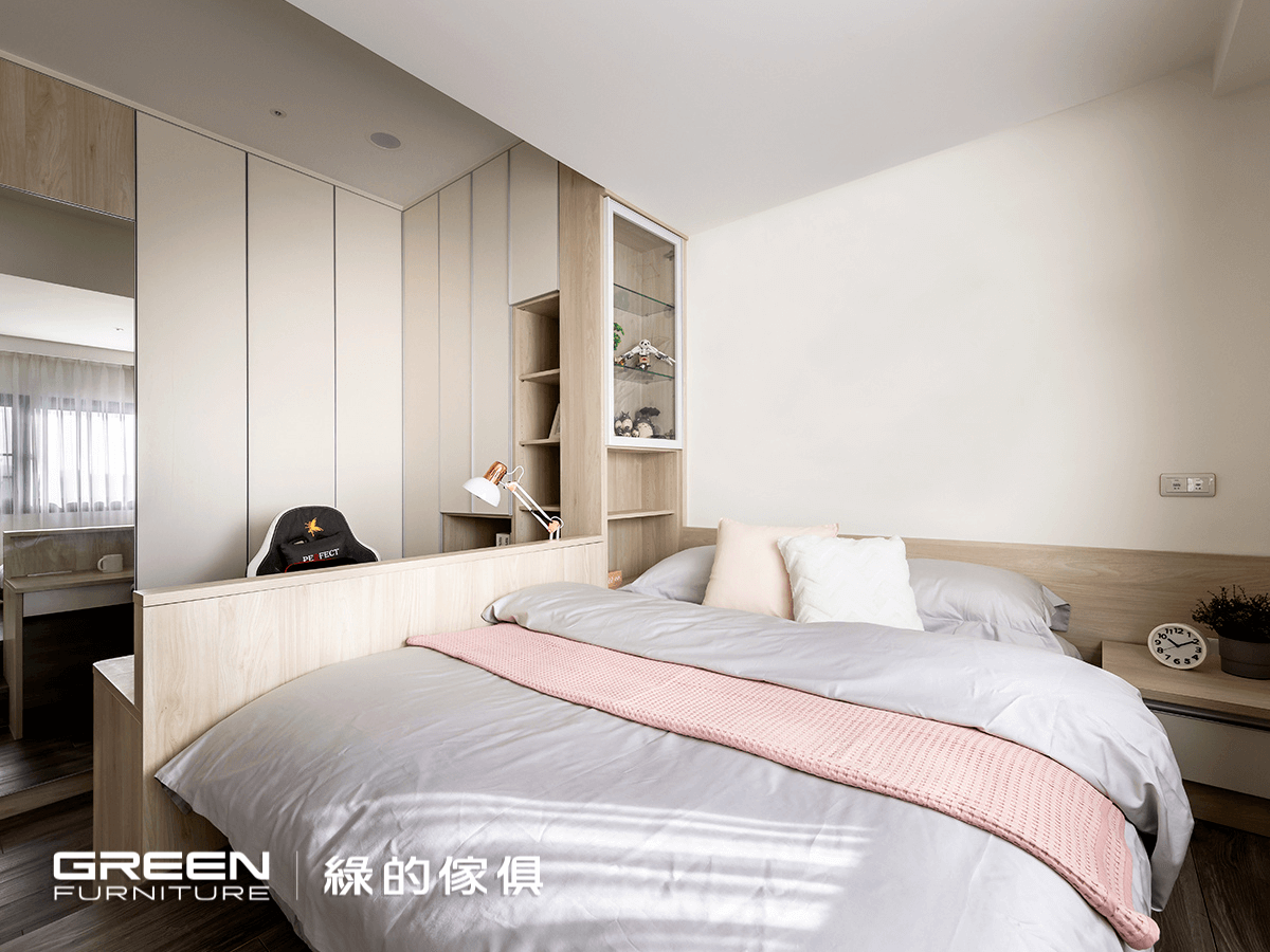 陽光恣意傾灑,一眼望去白詮為主軸的系統板材,架高地板上的空間昭示著這是主人休息的地方。展示櫃裡,珍視的收藏也沉浸在陽光正好的當下。架高的原創正是女兒,在舊屋空間不足時,兼具創意與美感的女兒當下就設計了架高床,對架高帶來的空間層次更是樂在其中。