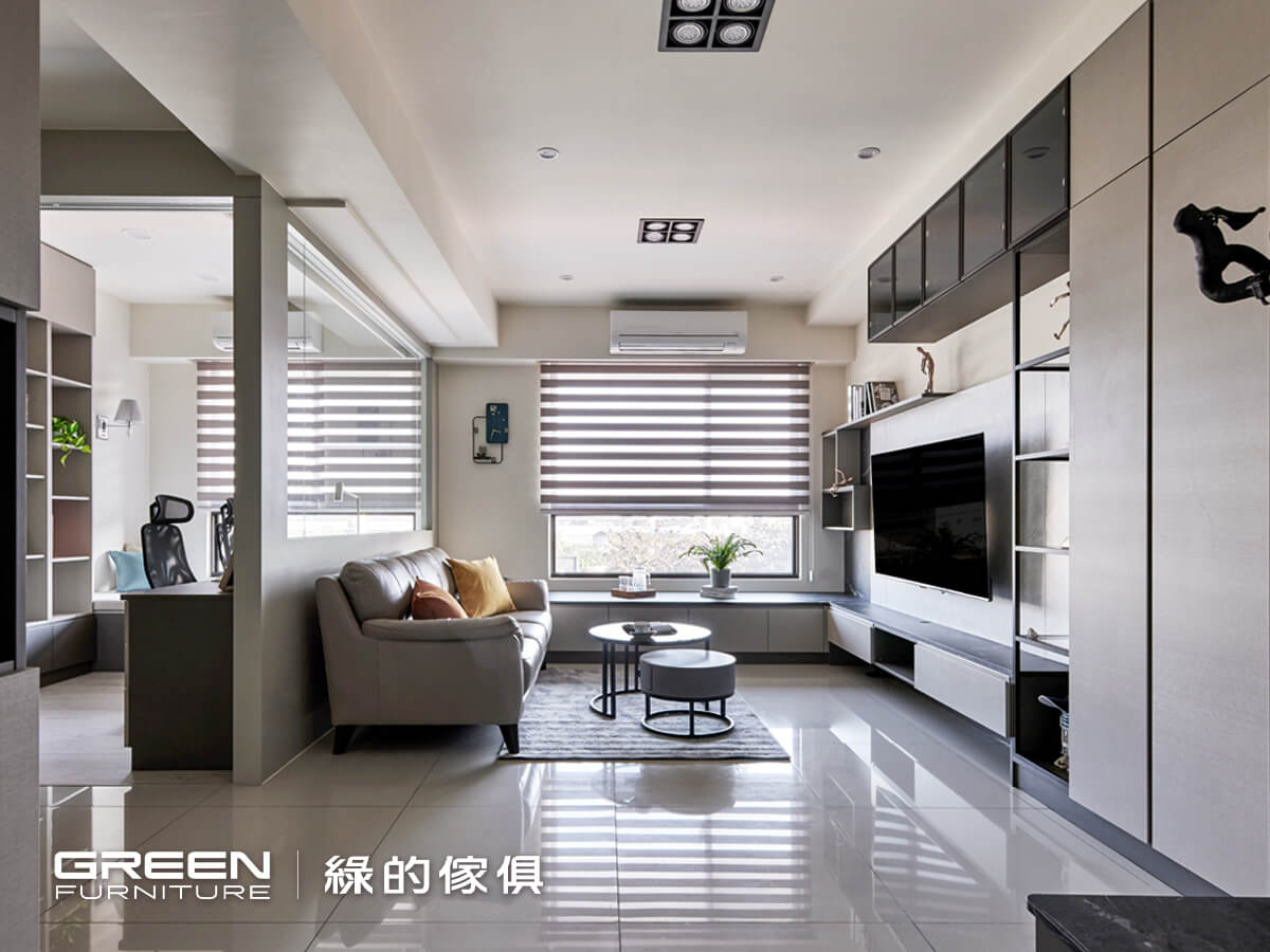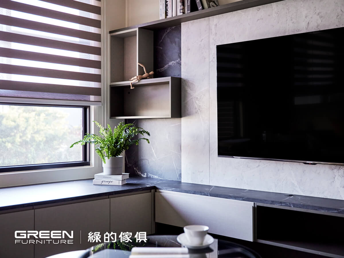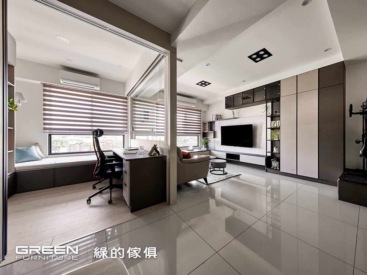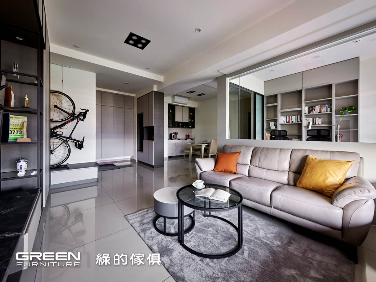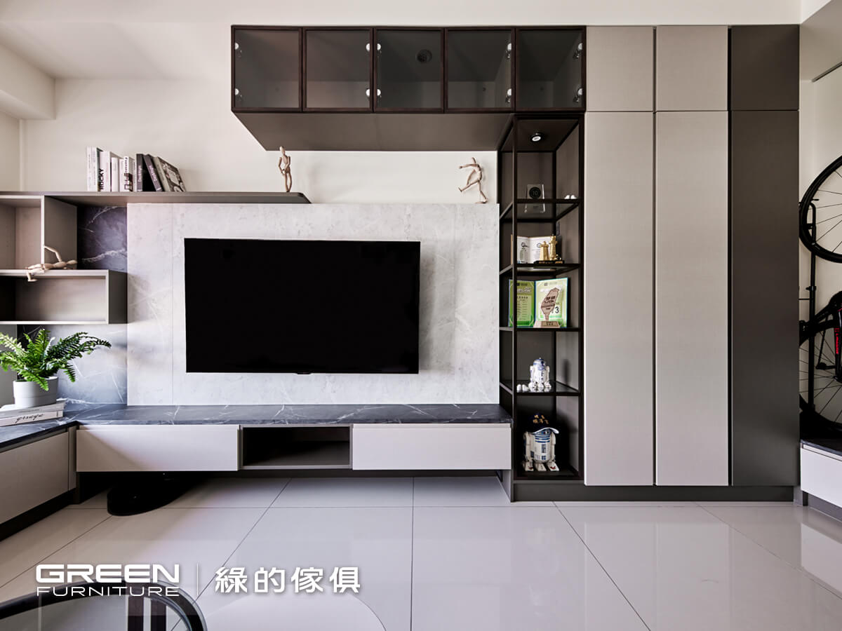 於是憑藉系統傢俱的高度靈活性,沿著立面砌築臥榻,並挹注上掀設計擴充收納機能,使自行車工具組有序歸放,只要將車架擺放於平台,即可使愛車成為一幅獨有光景;針對電視牆亦是細心調配,經過來回討論後,分別挹注「鈦絲褐」與「亞麻灰」,奠定簡約現代風裝潢基調。