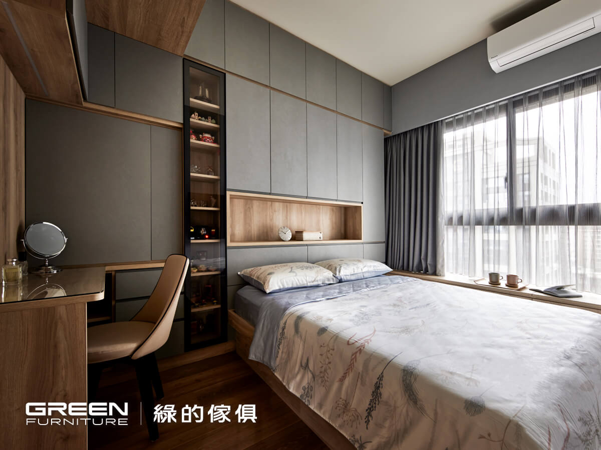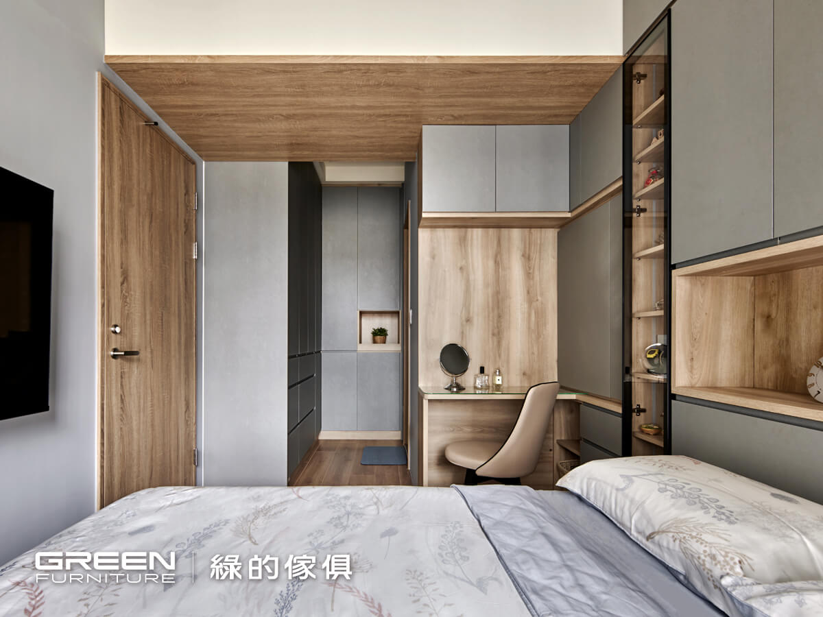 對著窗戶的化妝台,設計師精巧地將化妝鏡隱身在側邊收納櫃裡,打開櫃門即是延伸至化妝台的化妝鏡,絲毫沒有鏡面正對窗戶的擔憂。「綠的傢俱」原木色的可旋轉皮餐椅,在這裡搖身一變成了妝椅;一應俱全的更衣室也帶來驚喜的空間,兼顧收納與擺設。