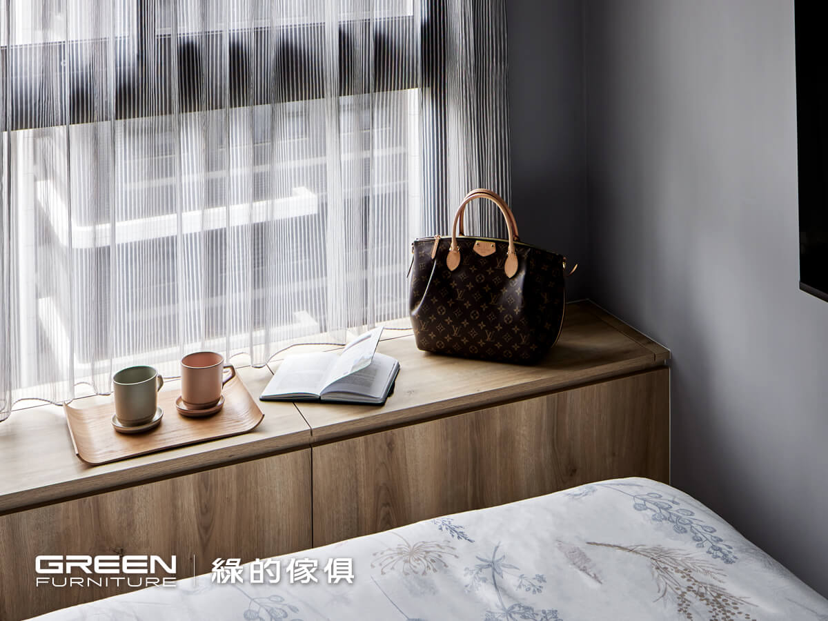 沿著窗邊而立的臥榻捎來禪意,隨著陽光灑落,讓人想擁抱一室的溫暖;趁著春意正濃,恣意享受這清逸悠閒的時光,格外寧靜寫意。臥榻下方的上掀式櫥櫃,提供額外的收納空間。友人來訪時,臥榻也搖身一變成了座位區。