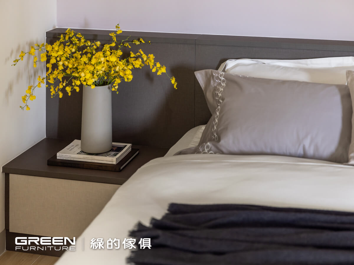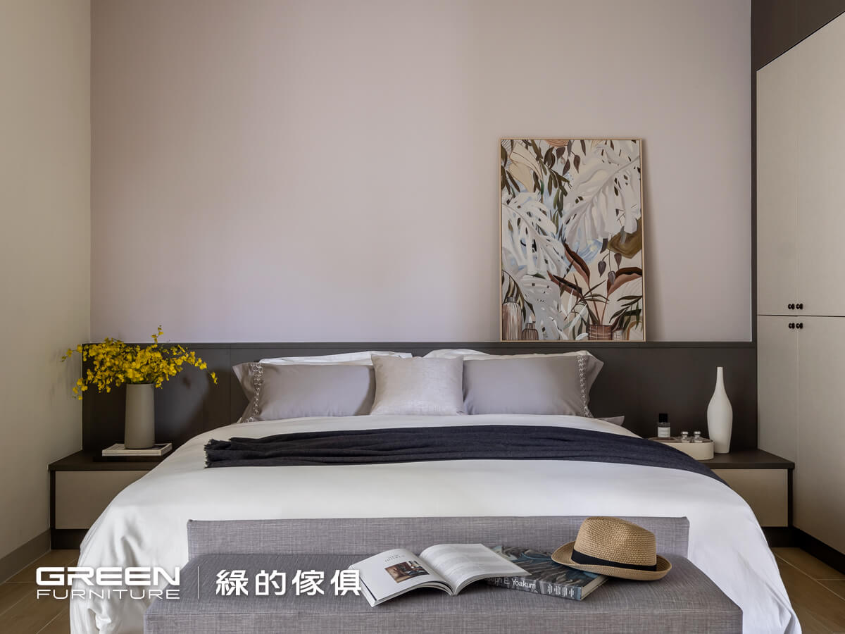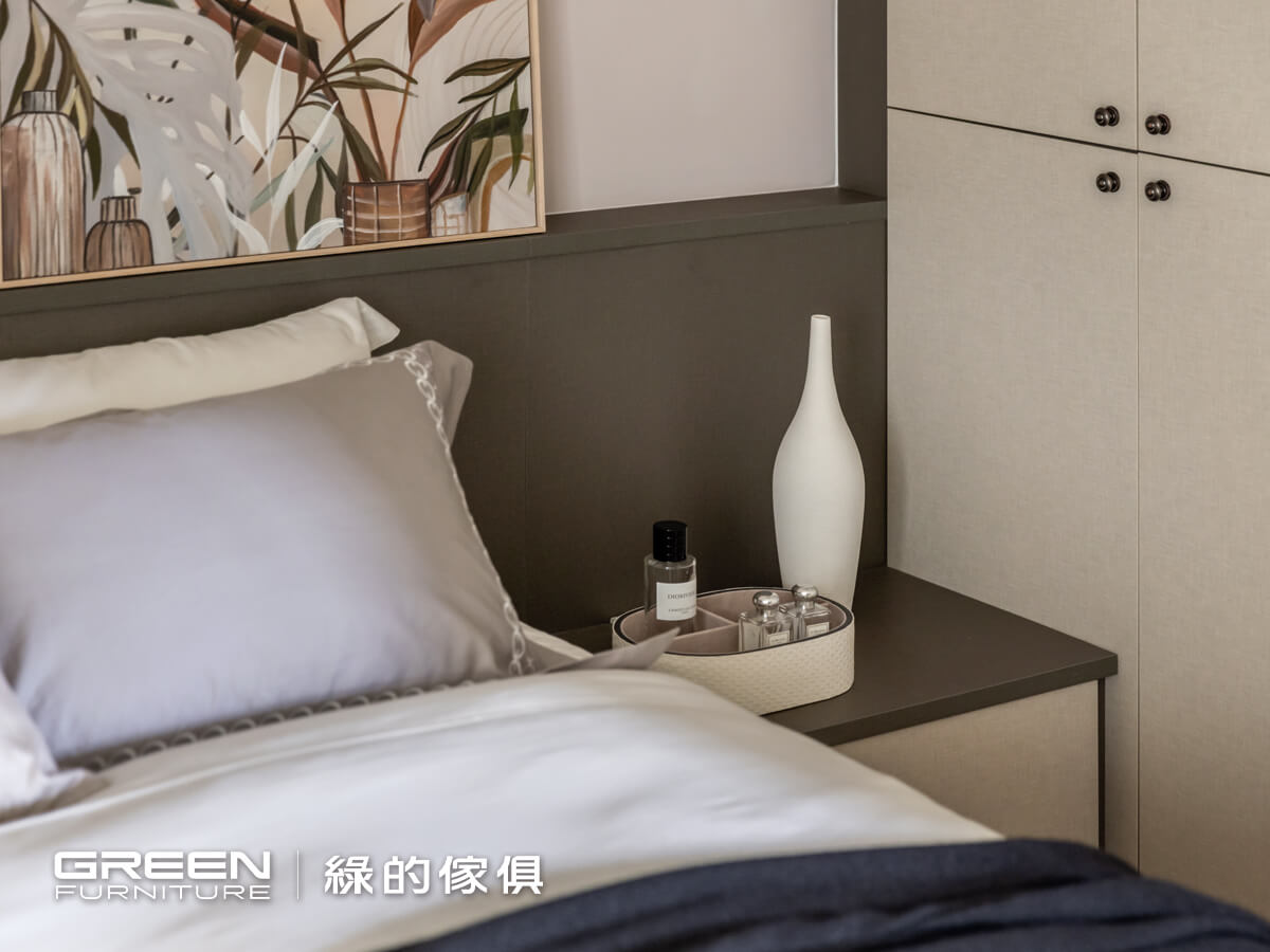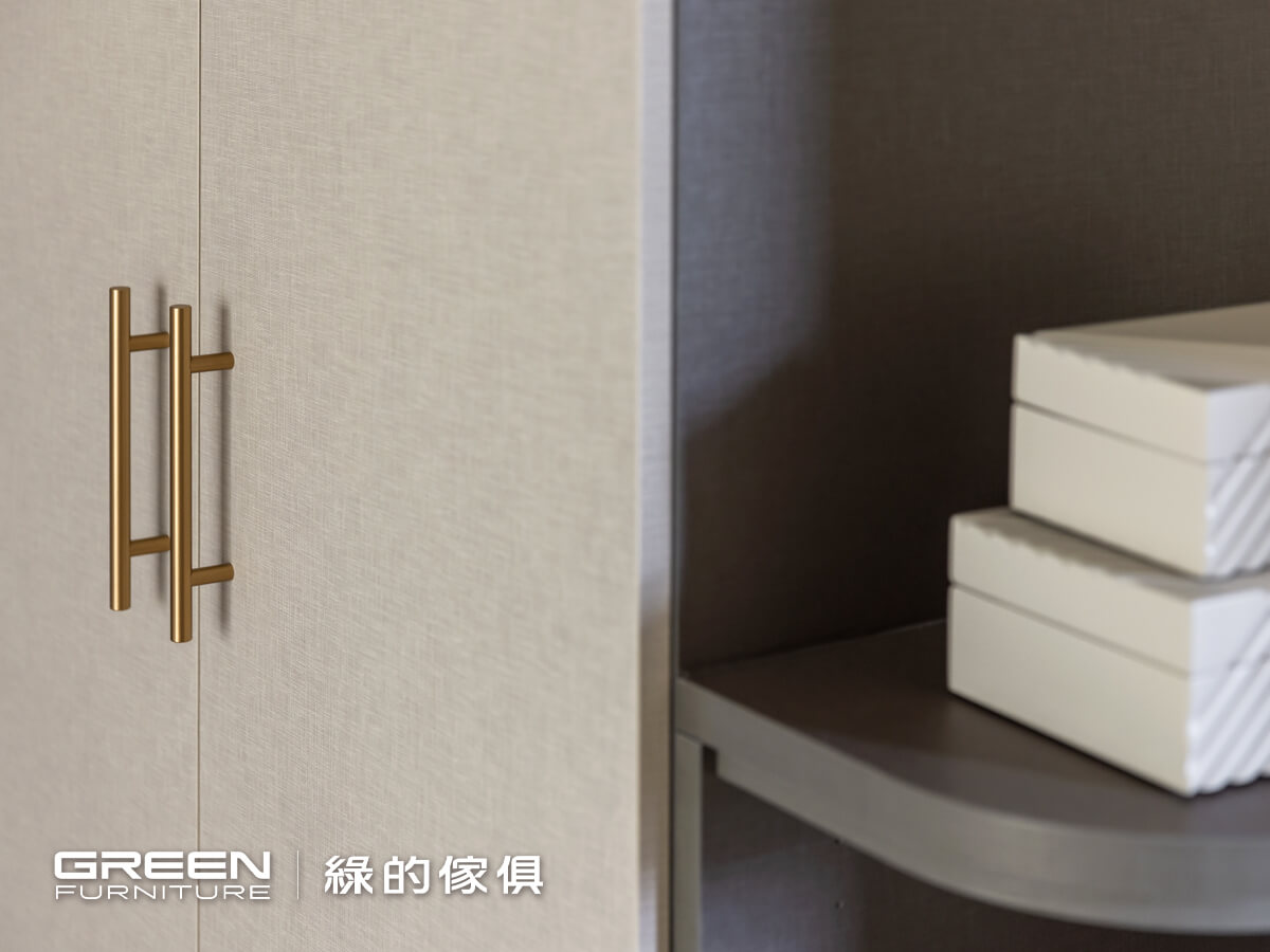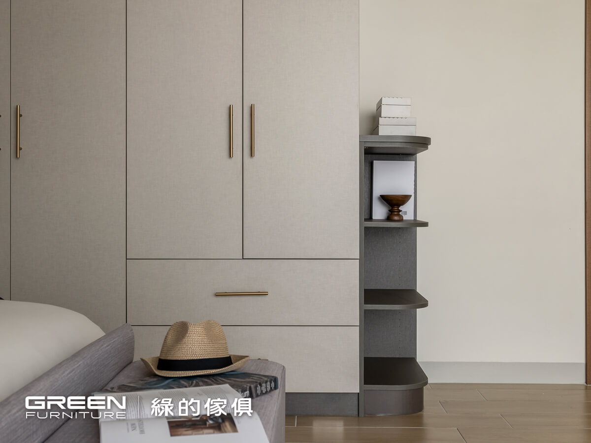 系統櫃設計師 左營Hola店-陳倍綺 理想家設計師 柯睿綺主人家的基本資料 地區 屏東縣 屋齡 新屋 室內坪數 (獨棟透天)80坪 格局 5房2廳2衛 居住人數 5人設計巧思主臥的黑灰色主調以鈦絲褐與亞麻灰為主,在布面的質材上點綴金色把手,既耐看又不退流行。整體設計以容易整理為主,針對需求打造大容量的收納空間。抽屜床的兩側設置無把手的抽屜式床頭櫃,補足床頭的使用空間。壁板也以同色系的板材完成,塑造整體感。衣櫃分別以金屬、復古銅、無把手搭配亞麻灰。以鈦絲褐打造的邊櫃,既可修飾邊角亦可作為展示區。鏤空的電視櫃以鈦絲褐延伸至天花板,深淺穠纖合度的比例搭配,即使與天花板接軌也不會有壓迫感。延伸閱讀:臥室設計規劃,這樣做就對了!=================「綠的傢俱」訂製您的專屬居家風格到府丈量:實體/雲端雙門市諮詢雙師諮詢服務:系統櫃設計師與室內設計師服務項目:整室規劃/室內設計/系統傢俱/系統櫥櫃預約諮詢服務 > 請點選 全省門市資訊 > 請點選