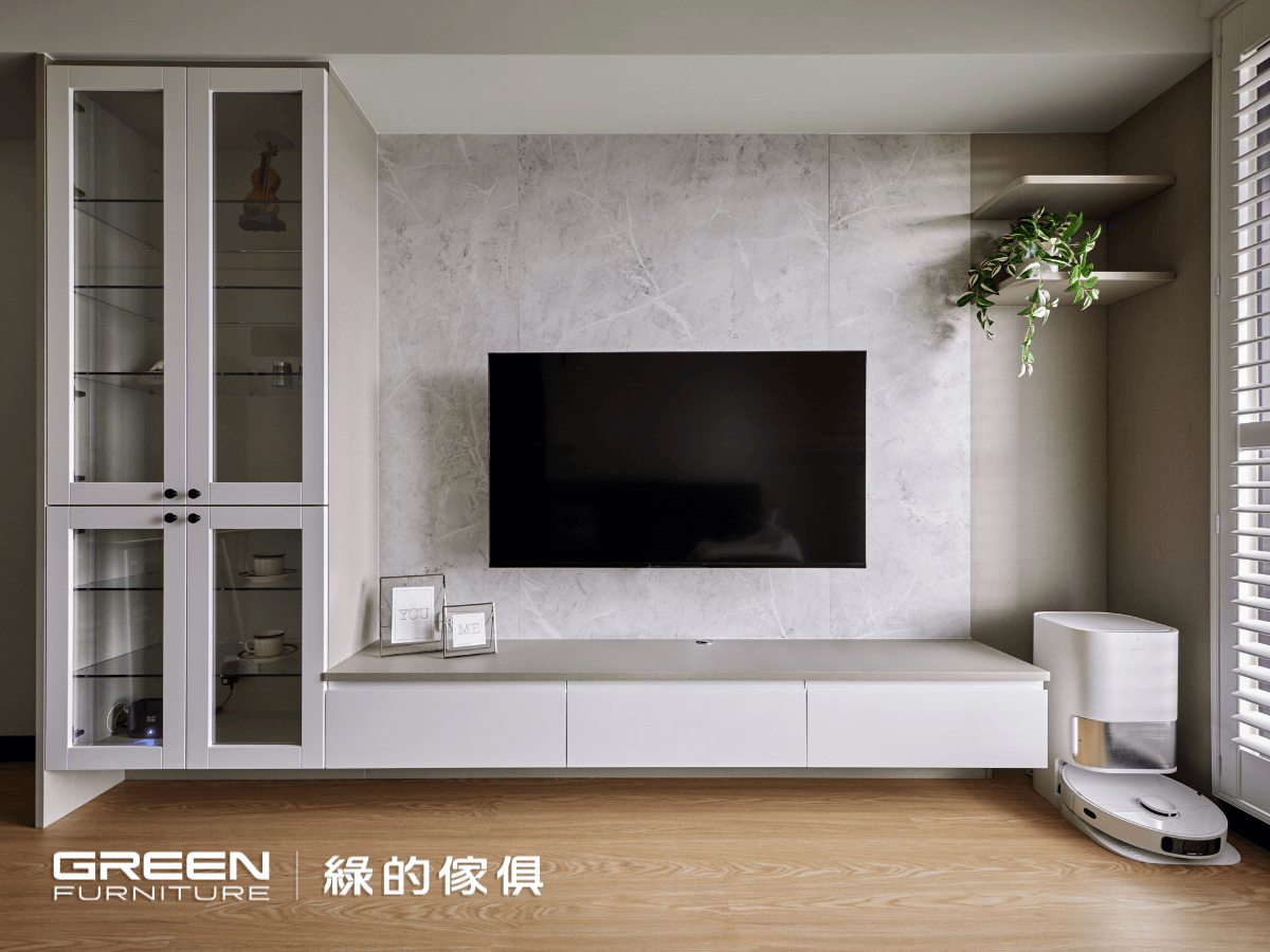 電視櫃以木作打底,再面貼仿大理石的白雲岩系統板材,與亞麻灰的壁板互相搭配,呈現出自然樸實的質感。燈櫃的直立式燈條與櫃體結合,方便層板隨時移動,不受佈燈位置的限制。陶瓷烤漆門片則搭配黑色把手,異材質的結合隱隱帶著美式鄉村風氛圍,也讓空間更有立體感。