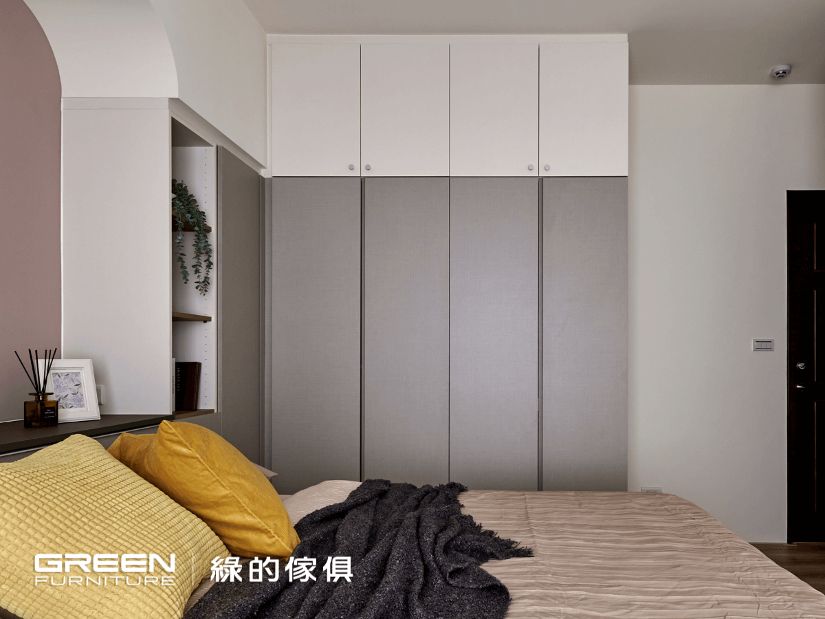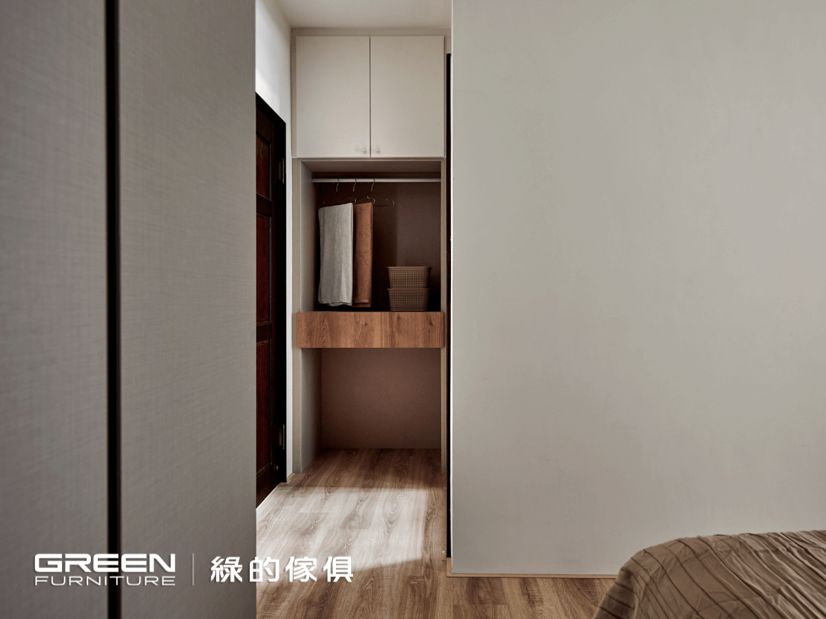 主臥門後的開放衣櫃,便於置放二次衣物,原木質感的白色鑼帛與核橡,為衣櫃的不同功能收藏劃出分界。側邊滿版的落地衣櫃,以鑼帛與亞麻灰打造,純粹且溫暖。轉角型衣櫃和床頭櫃以鈦絲褐為板材,與下掀式床頭櫃各自提供了便利且充足的收納空間。