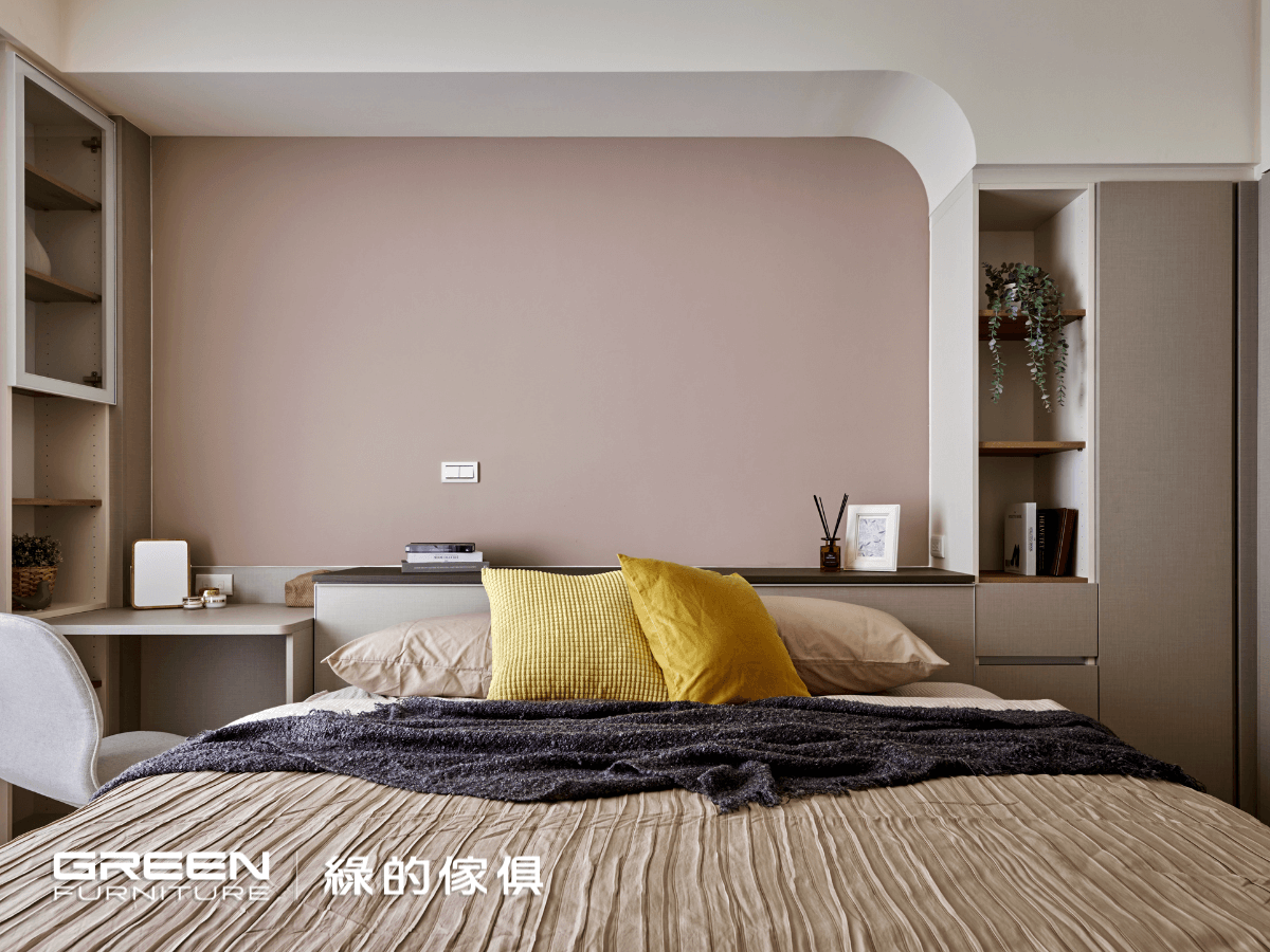 床頭櫃上方的樑柱在圓弧造型的修飾下,柔化了空間視覺。玫瑰粉的牆面也來為整室的清新增添更多韻味。臨窗的開放式書櫃則巧妙地將樑柱隱身,隔絕了視覺的干擾。