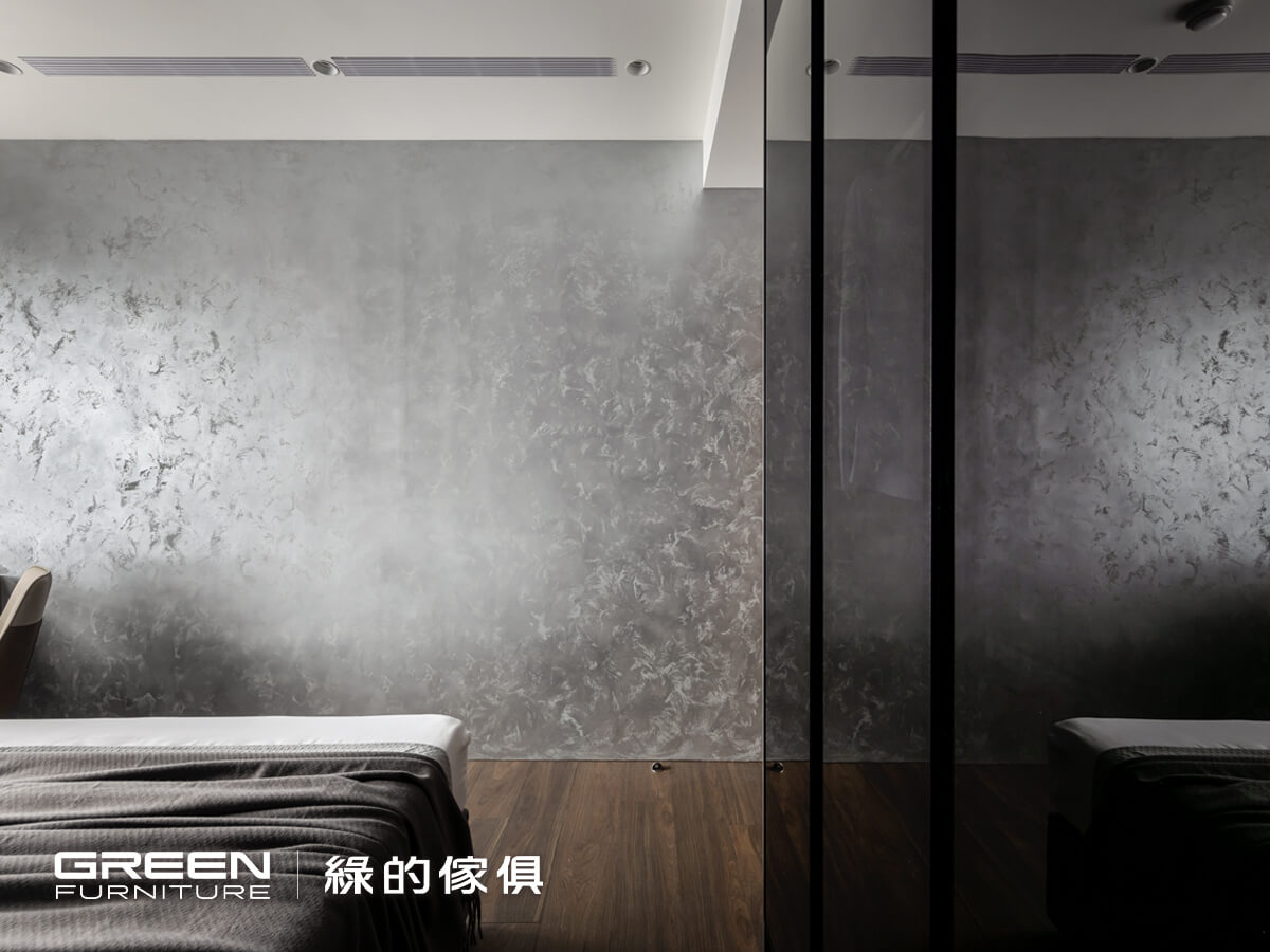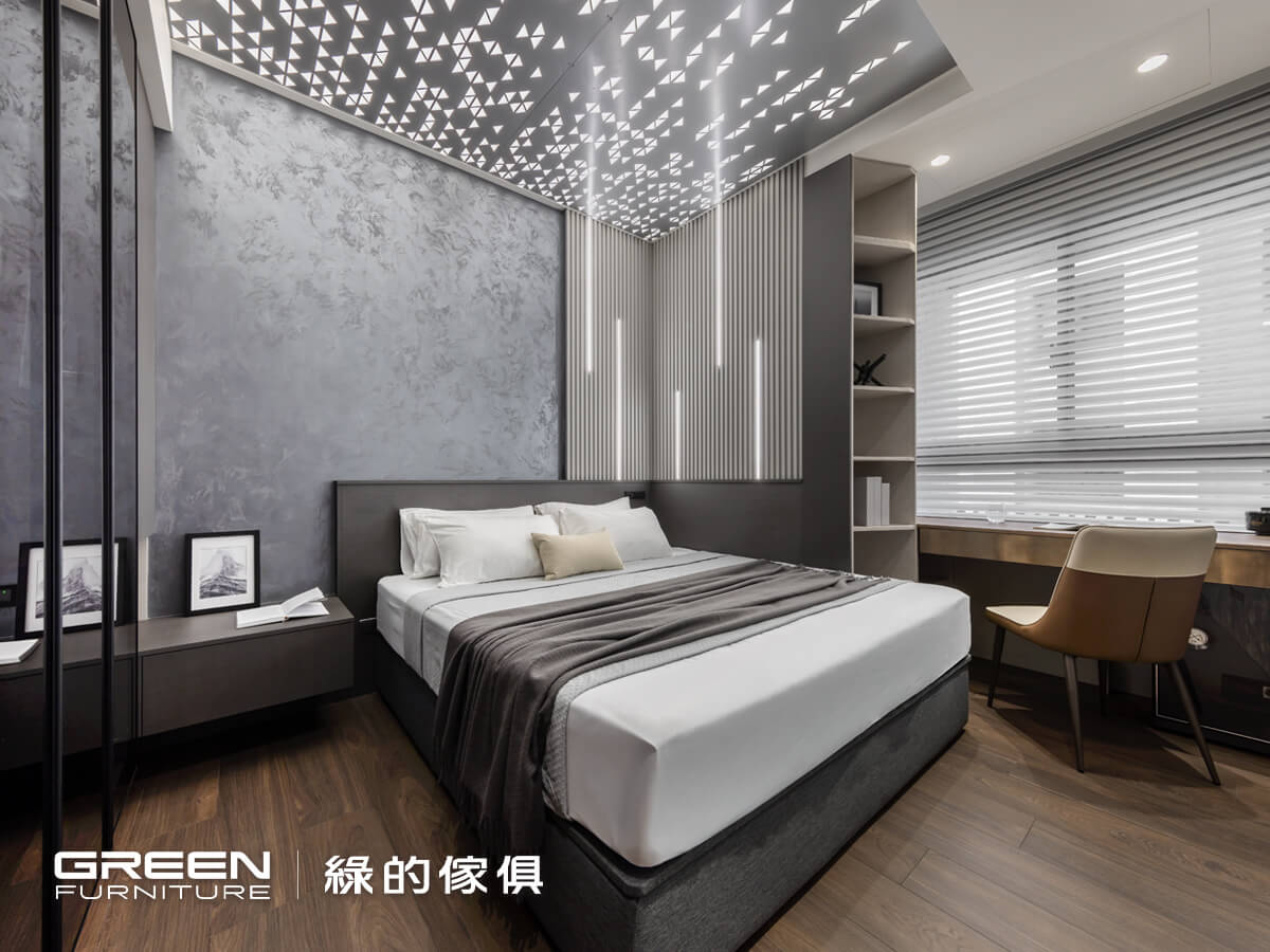 天花板特製的不鏽鋼沖孔天花板,充滿了序列的科技感與個性,是設計師特別考量疏密度,以不鏽鋼雷射切割而成。整體色調以黑灰為主,深灰色系塗料偕同格柵的牆面,再以燈條點綴作為視覺的延伸,與L型床頭系統櫃有一氣呵成的默契。臨窗的桌面則以金屬鏽蝕感的流沙金,帶來些許氛圍的變化。