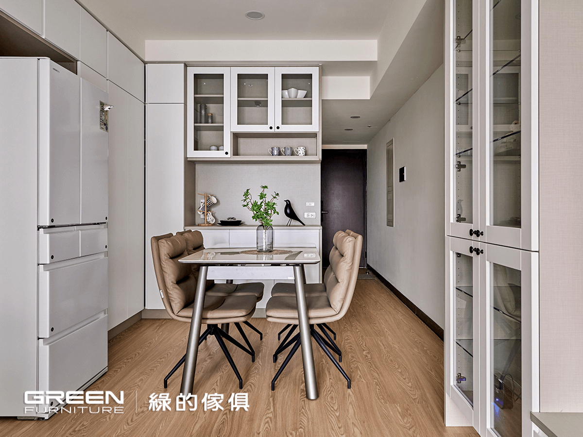 L型的櫃體設計,將玄關櫃與餐櫃完整結合,動線更顯開闊。邊角以圓弧收邊,餐櫃上方搭配鏤空與玻璃櫃,創造穿透感。角落的餐櫃是大面積的L型櫃體,方便各式收納,一體成形的隔板也方便自行移動高度。因廚房動線較小,所以將冰箱的位置變動出來餐廳與餐櫃這樣的結合一點也不突兀,使用上更為方便。前方的白色的岩板餐桌沿襲一路的素雅,桌面可伸縮調整,以便靈活運用。