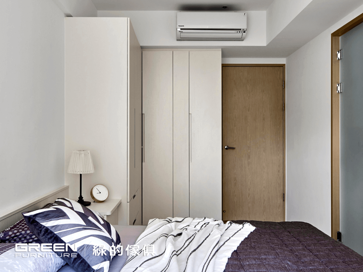 由於空間較為狹長,屋主希望可以用淺色系來規劃。鋁條點綴著上約門,轉角型衣櫃搭配特殊五金,155°的特殊鉸鏈讓櫥櫃可以輕鬆地大弧度拉開,不因空間受限。岩灰與鑼帛打造的衣櫃與各個傢俱及樑柱貼齊,既沒有浪費空間,也不見樑柱邊角的干擾,整體線條整齊又乾淨。設計師塑造出的空間完整又高挑,也讓整室飄著滿滿的自然風。