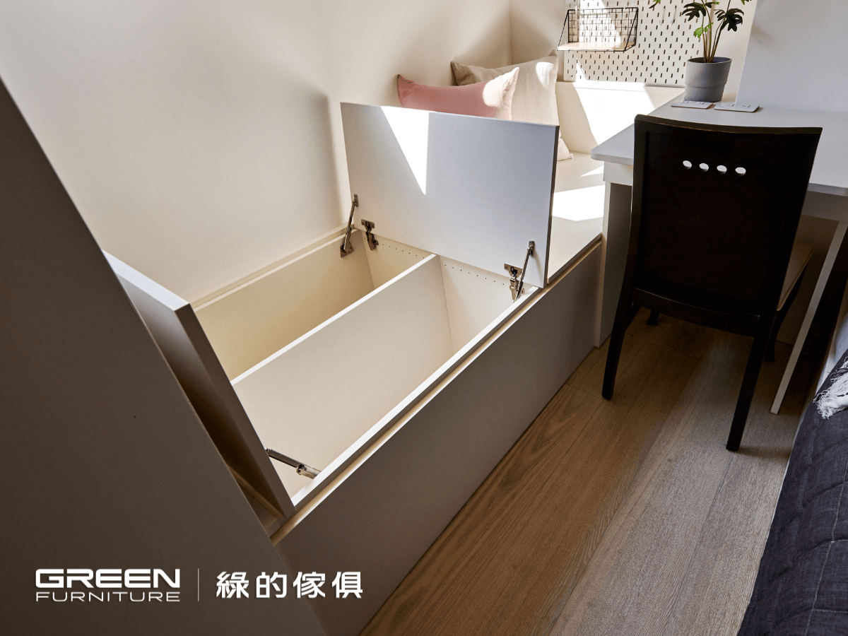 臥榻下方則是滿版的儲存空間,開啟儲藏櫃的上掀式拉門輕鬆就可完成收納與取用。臥榻的高度沿著書桌與床頭櫃切齊,隨著視野轉動,空間井然有序,更顯得乾淨俐落。小巧的書桌則扮演著複合式功能,既是書桌,也是化妝台。