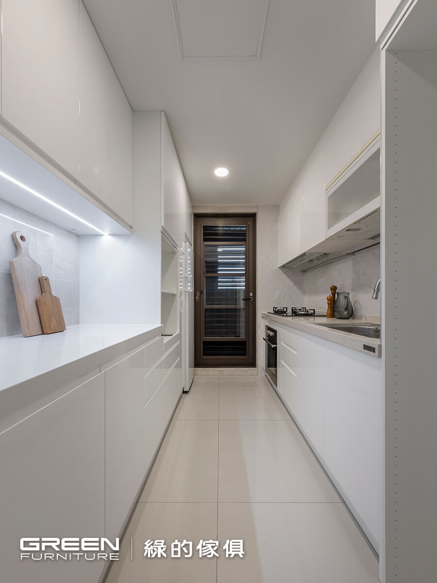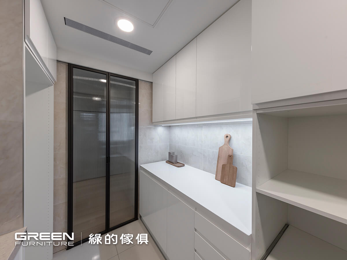 廚房以玻璃拉門隔間,兼顧獨立性與光線流通。檯面選用賽麗石,堅固耐刮又易清潔;牆面採日本 AICA 防火板,耐高溫且維持俐落質感。