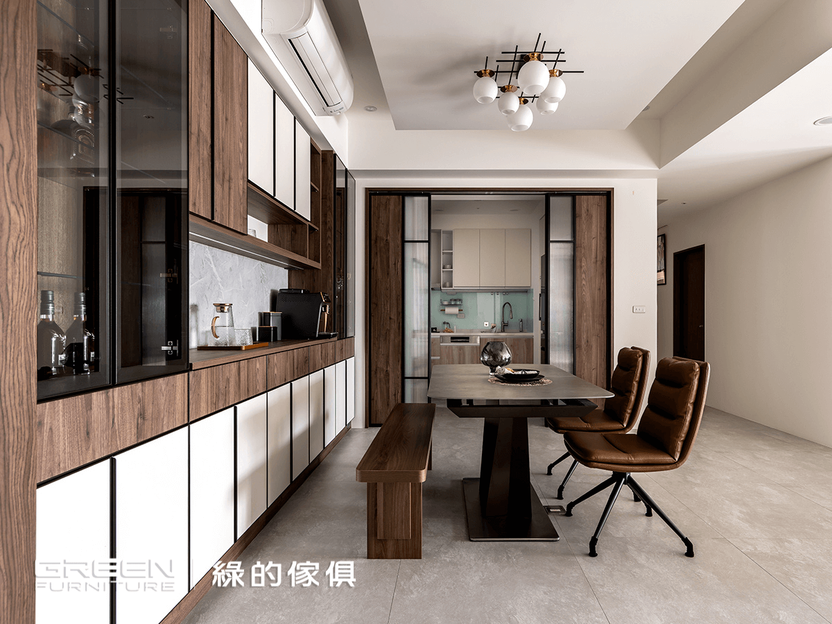中西兼容的滿版餐櫃沿著壁面而立,鋁框把手呼應著線條的整齊與和諧。與餐櫃比鄰的長虹玻璃與清玻,是由胡桃木撐起的推拉門,猶如餐廳裡一抹晶瑩又沉穩的端景;屋主難掩滿足地說:「這扇推拉門收穫眾多好友的讚賞。」
